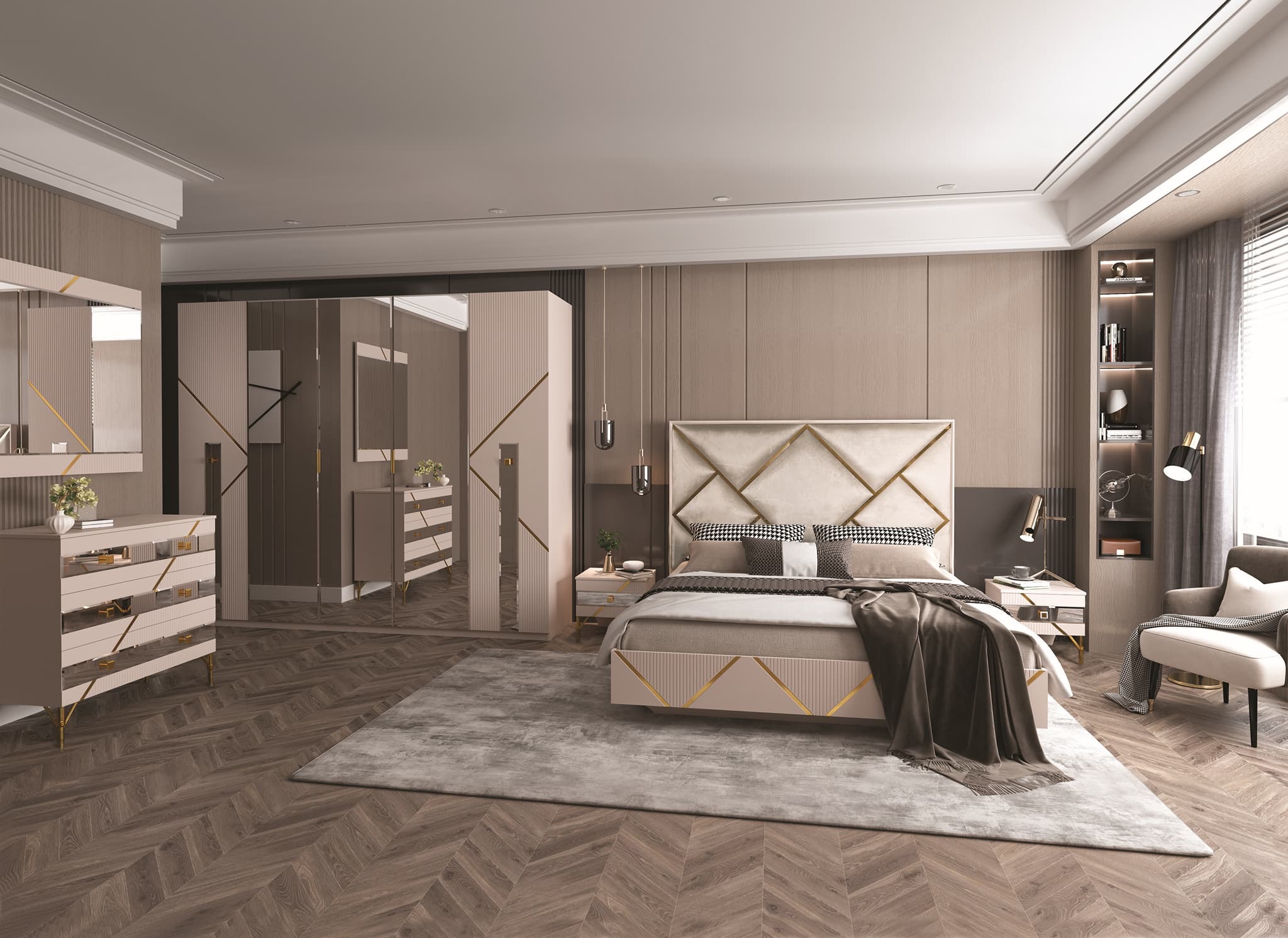 Коллекция мебели «Ализе» — ваш ключ к созданию стильного и комфортного интерьера! Яркие акценты зеркала в золотой раме, элегантность серых и песочных оттенков, прочность ЛДСП и удобство фурнитуры Boyard подарят вам истинное удовольствие от использования этой коллекции. Мягкая обивка изголовья кровати из микро велюра создаст атмосферу уюта и тепла, а современный дизайн дополнит интерьер вашей мечты.