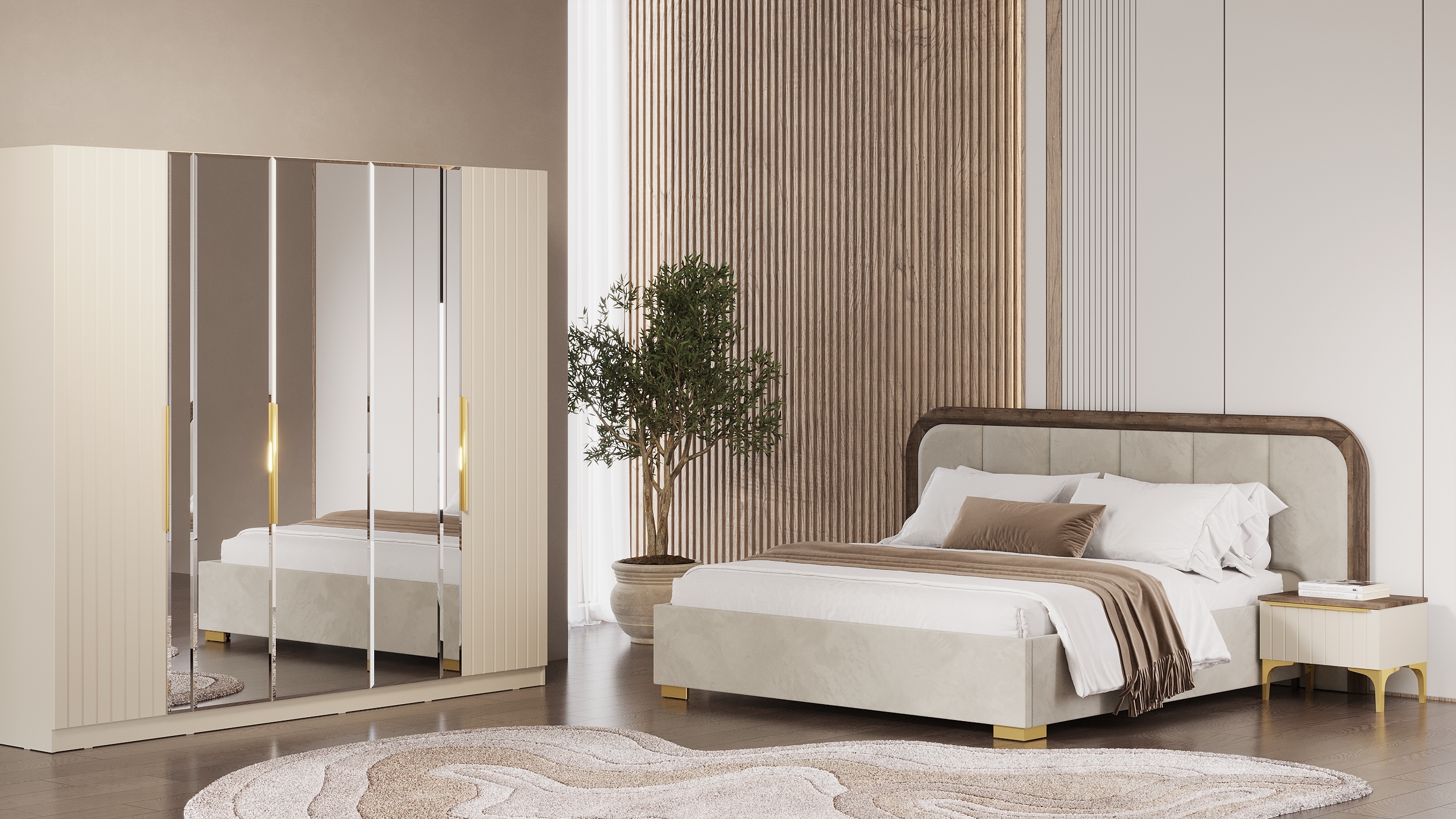 Коллекция мебели «Аврора» Сатин — это воплощение элегантности и комфорта! Ваша спальня превратится в уютное убежище благодаря изысканному сочетанию сатинового оттенка, дуба скандинавского и мягкой текстуры микровелюра. Элегантные зеркала с фацетом, шкафы из ЛДСП с фрезеровкой фасадов LMDF и качественная фурнитура SKMF подарят вашему интерьеру гармонию и стиль. Создайте атмосферу тепла и уюта вместе с коллекцией «Аврора».