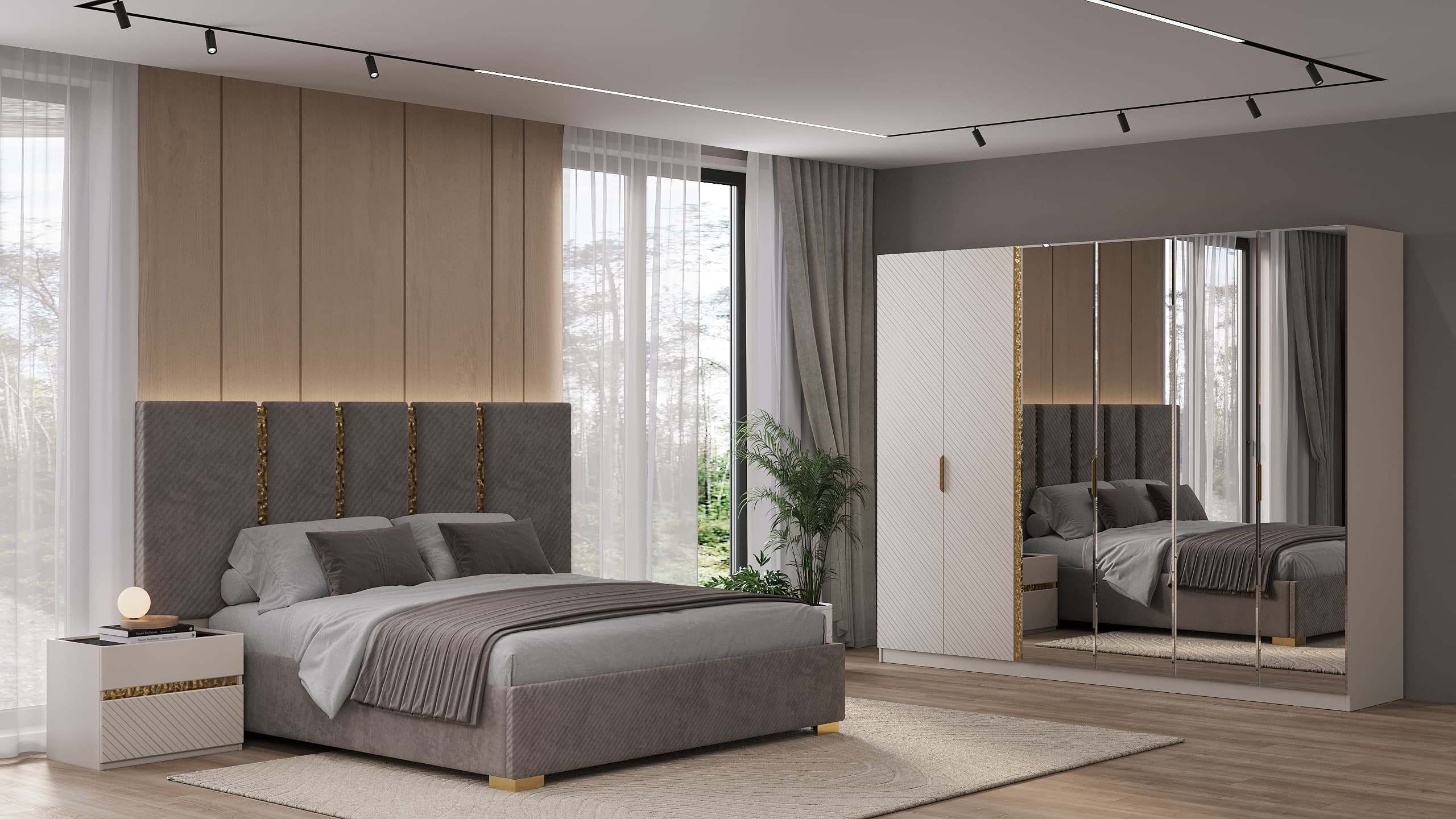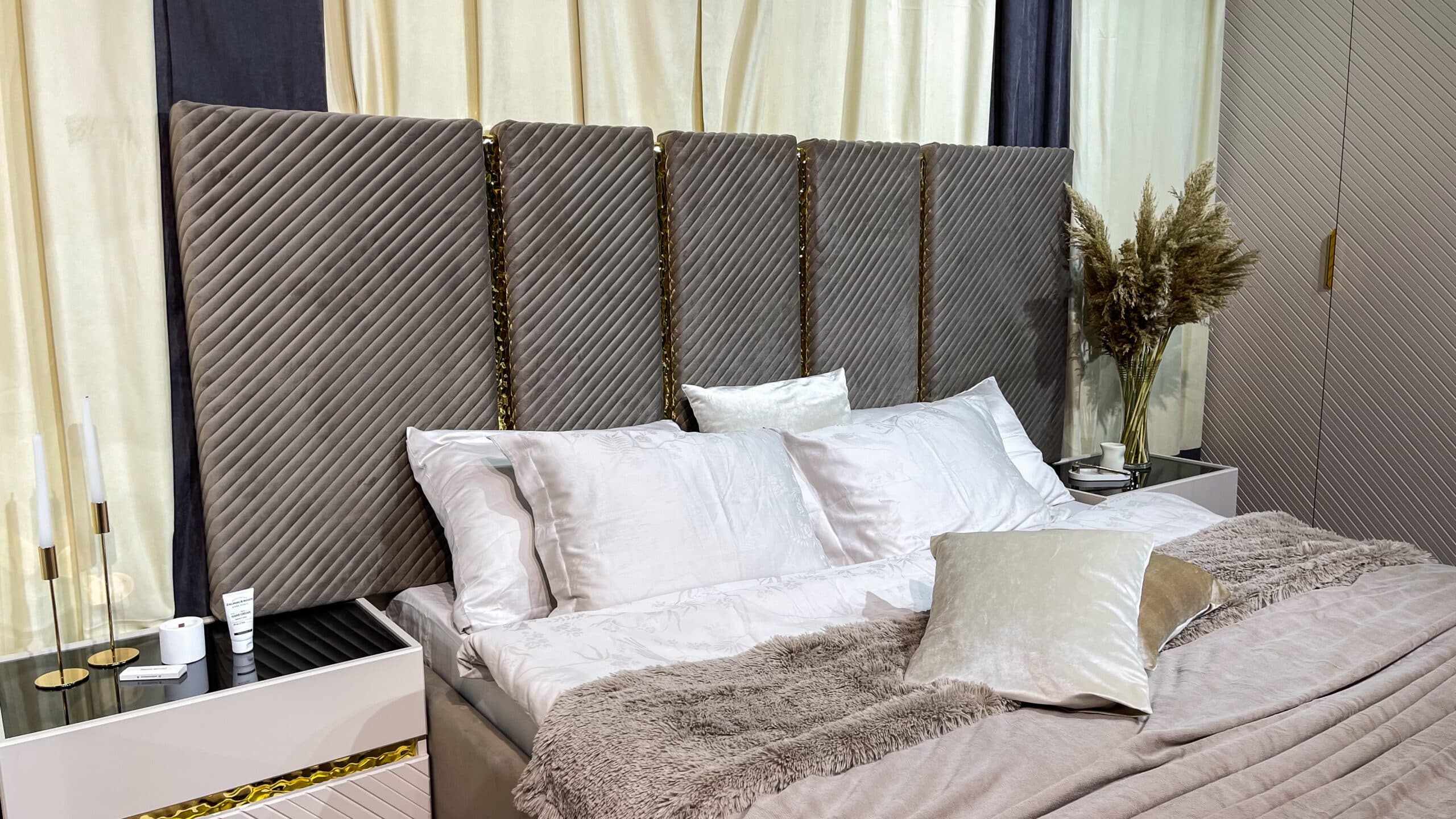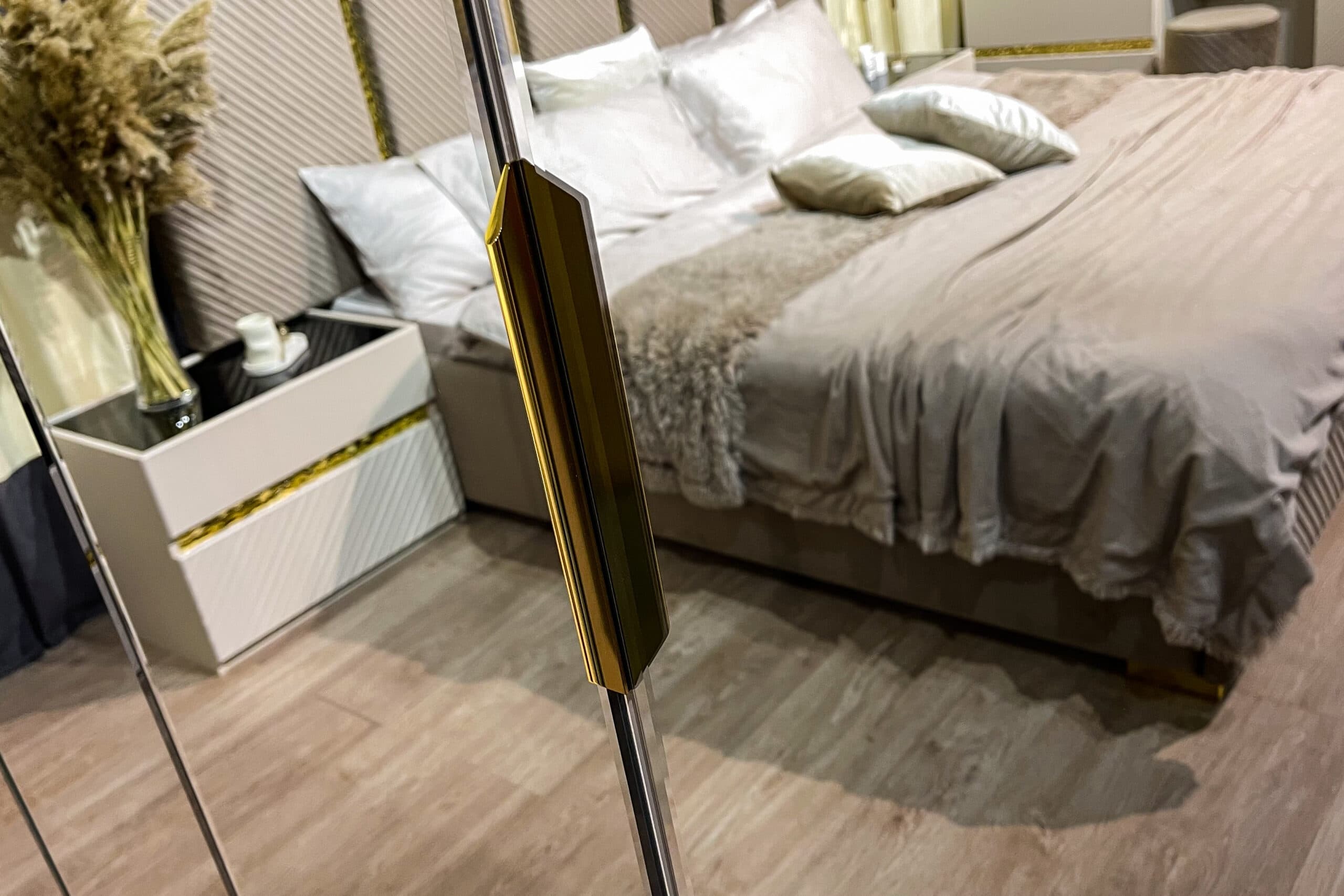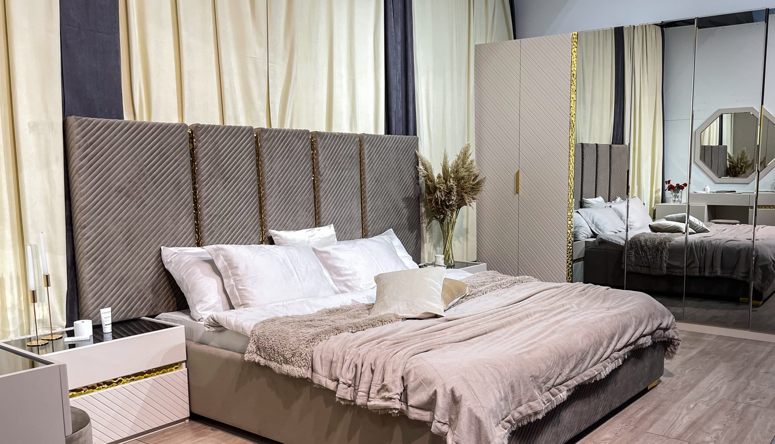 Коллекция мебели «Грация» — воплощение элегантности у вас дома! Мебель из ламинированного ДСП с фасадом ЛМДФ цвета сатин подчеркнёт ваш безупречный вкус. Мягкая кровать с микро велюровым изголовьем обеспечит комфортный отдых, а зеркала с прямым фацетом подарят простор даже самой небольшой комнате. Бонус – качественная фурнитура SKMF и стильные золотистые молдинги сделают интерьер завершенным и роскошным. Наслаждайтесь гармонией стиля и удобства вместе с коллекцией «Грация».