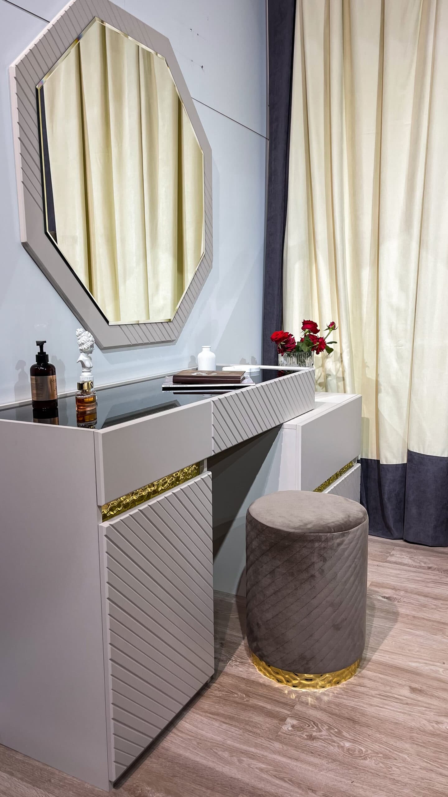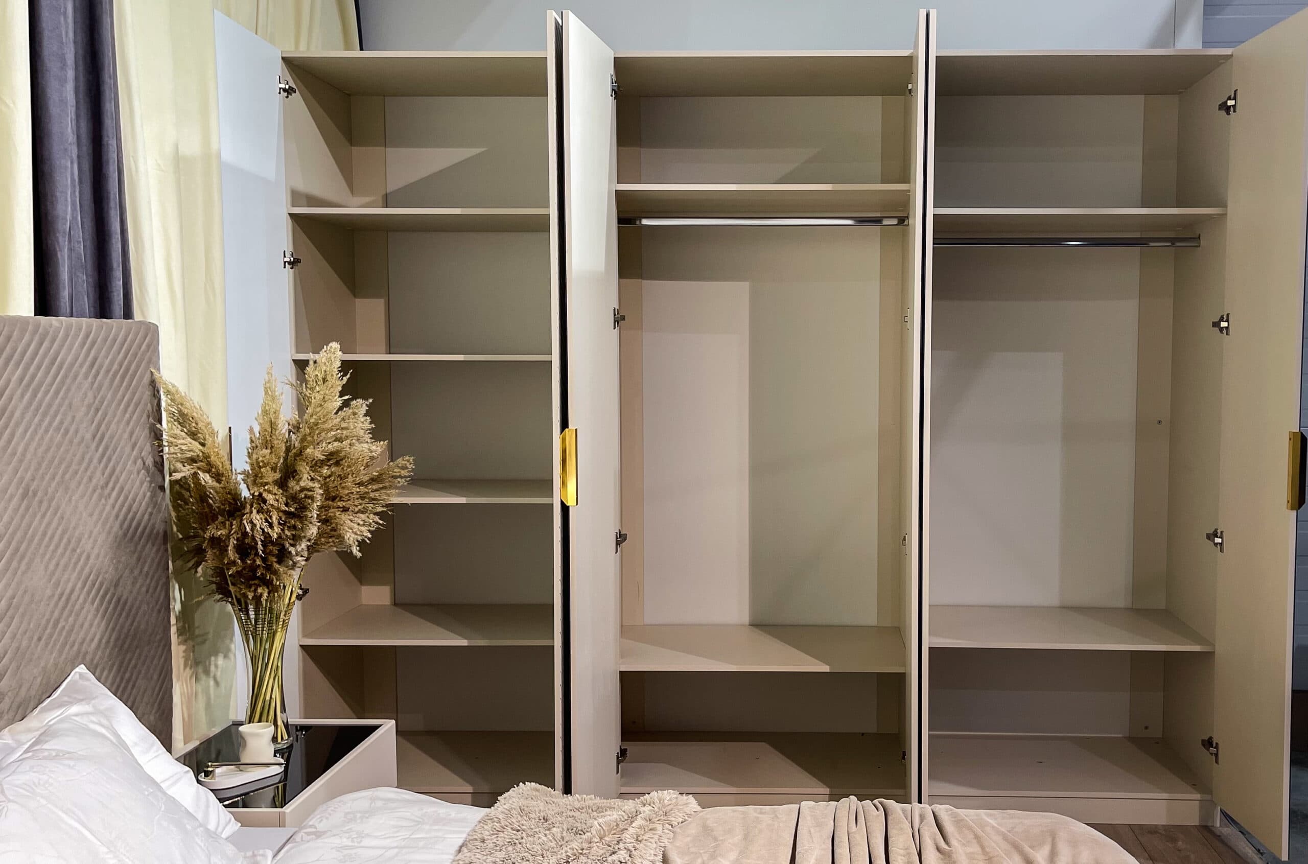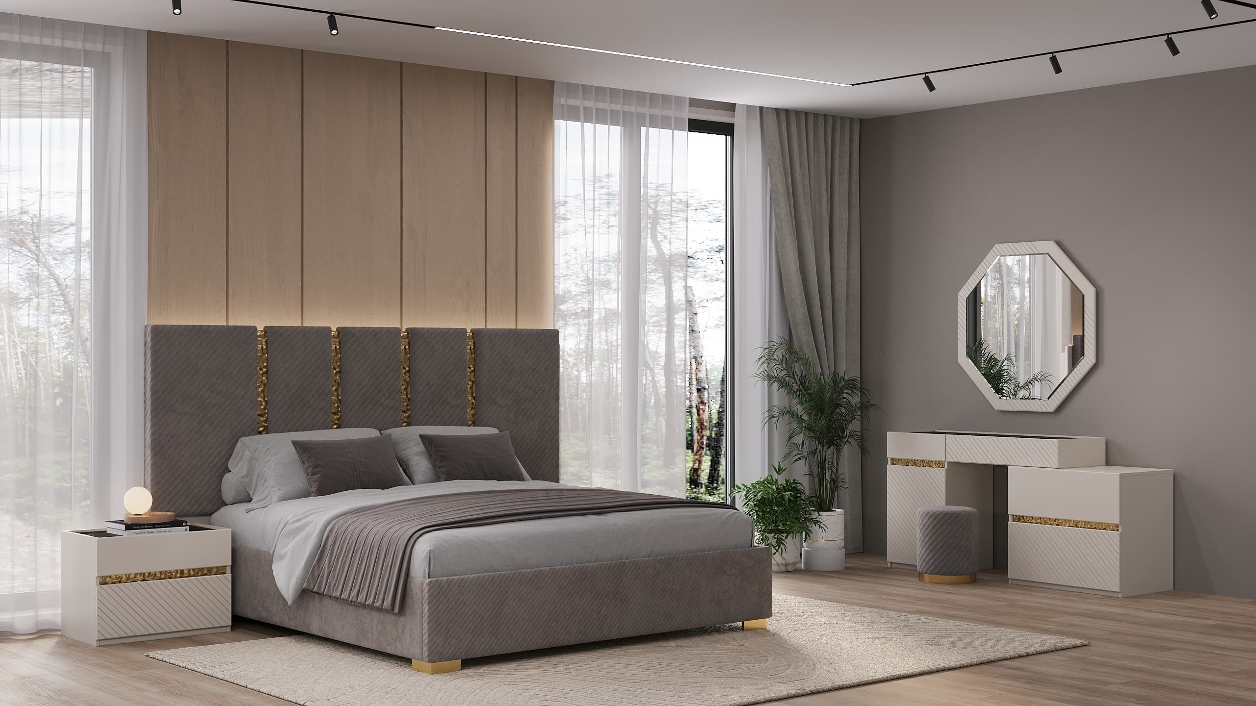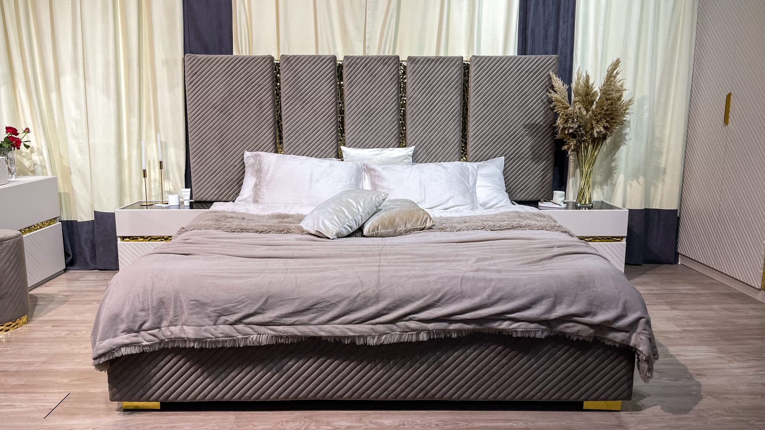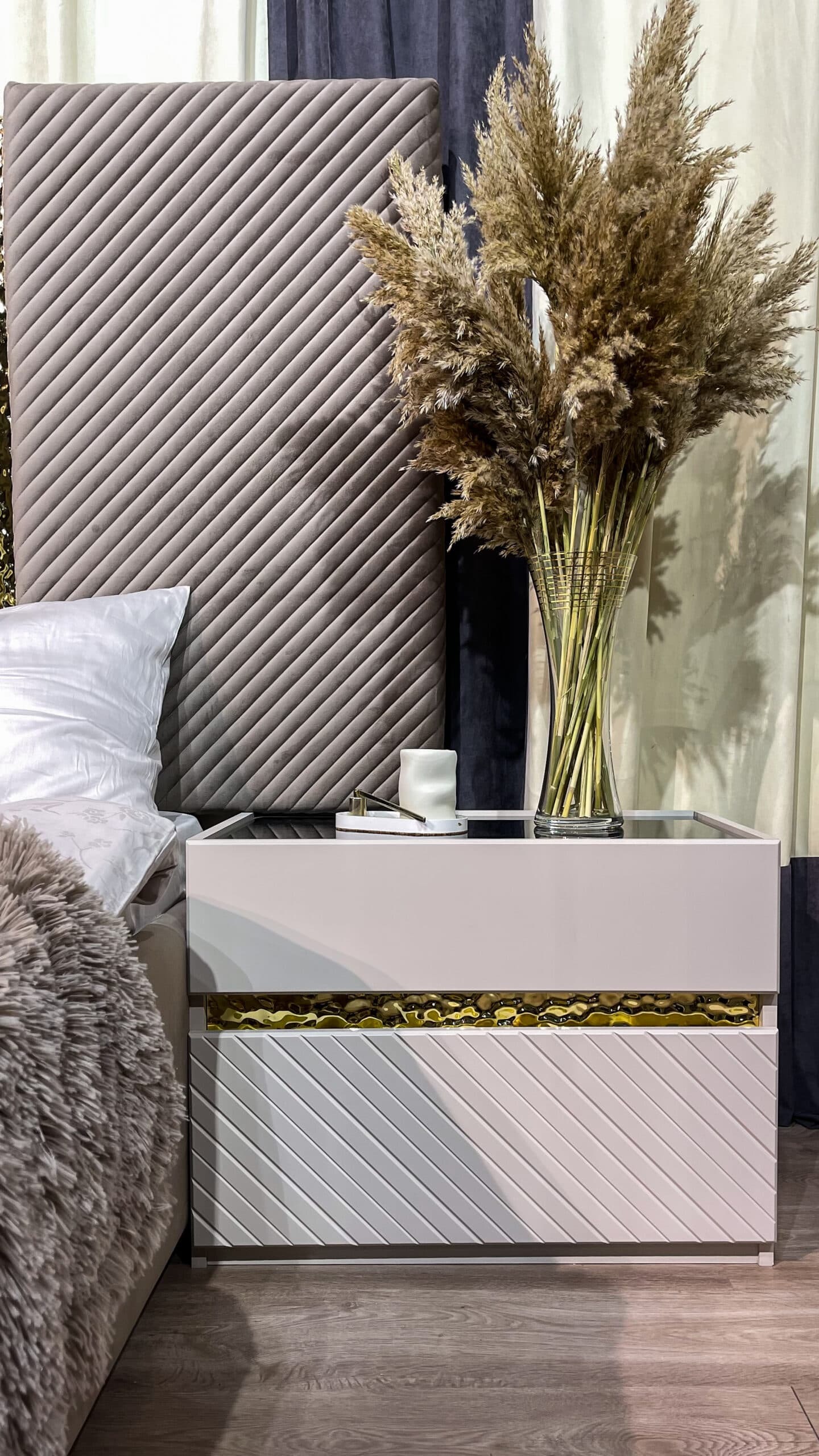 Коллекция мебели «Грация» — воплощение элегантности у вас дома! Мебель из ламинированного ДСП с фасадом ЛМДФ цвета сатин подчеркнёт ваш безупречный вкус. Мягкая кровать с микро велюровым изголовьем обеспечит комфортный отдых, а зеркала с прямым фацетом подарят простор даже самой небольшой комнате. Бонус – качественная фурнитура SKMF и стильные золотистые молдинги сделают интерьер завершенным и роскошным. Наслаждайтесь гармонией стиля и удобства вместе с коллекцией «Грация».
