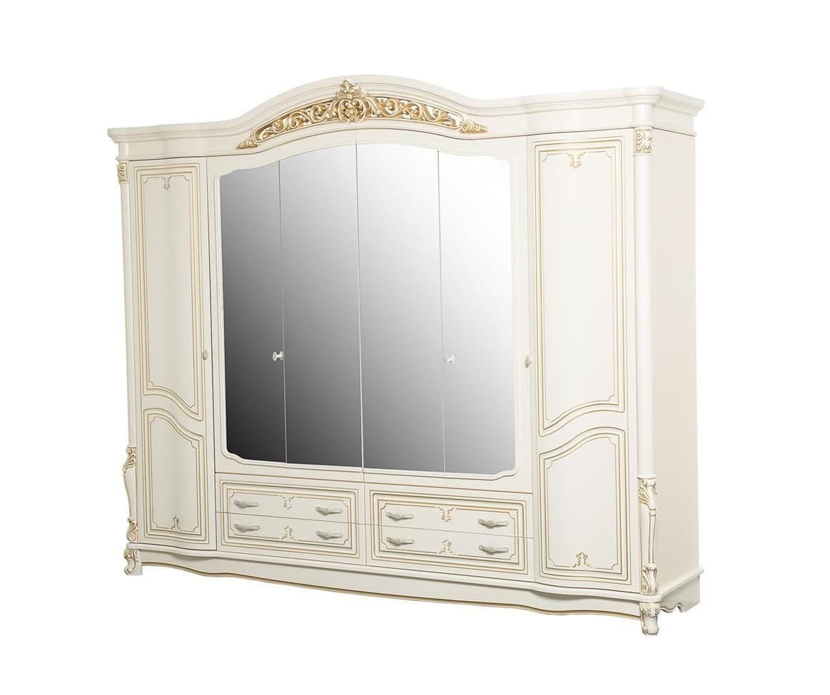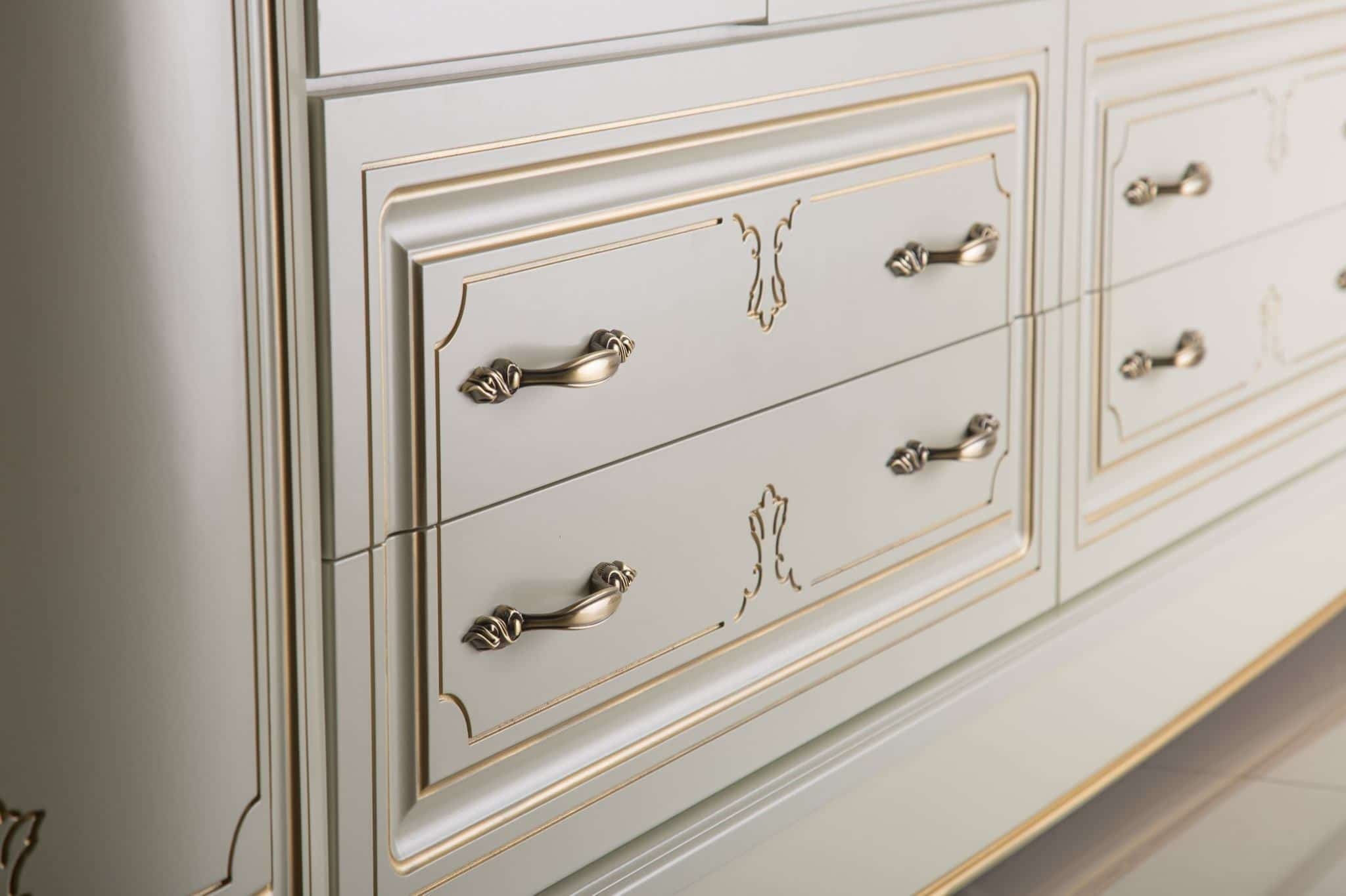 гнутый и прямой, крашеный ЛМДФ с фрезеровкой и элементами декора, карниз и стоевые из пенополиуретана, лак матовый (ICA, Италия)