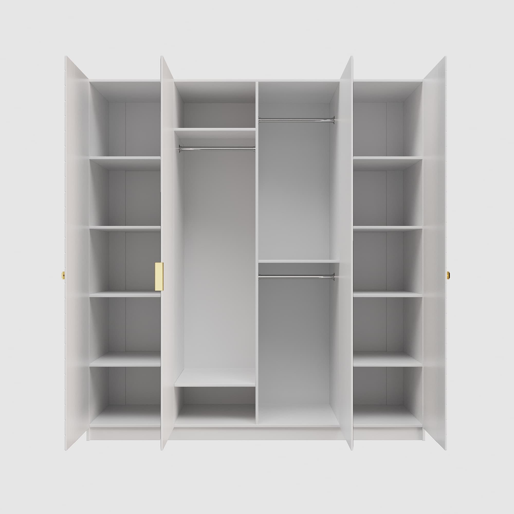 Шкаф 4-х дверный – ш: 2000 мм, г: 600 мм, в: 2100 мм Кровать – ш: 2035 мм, г: 2051 мм, в: 1316 мм Тумба – ш: 476 мм, г: 400 мм, в: 416 мм Комод – ш: 960 мм, г: 450 мм, в: 903 мм Зеркало – ш: 886 мм, г: 16 мм, в: 1050 мм