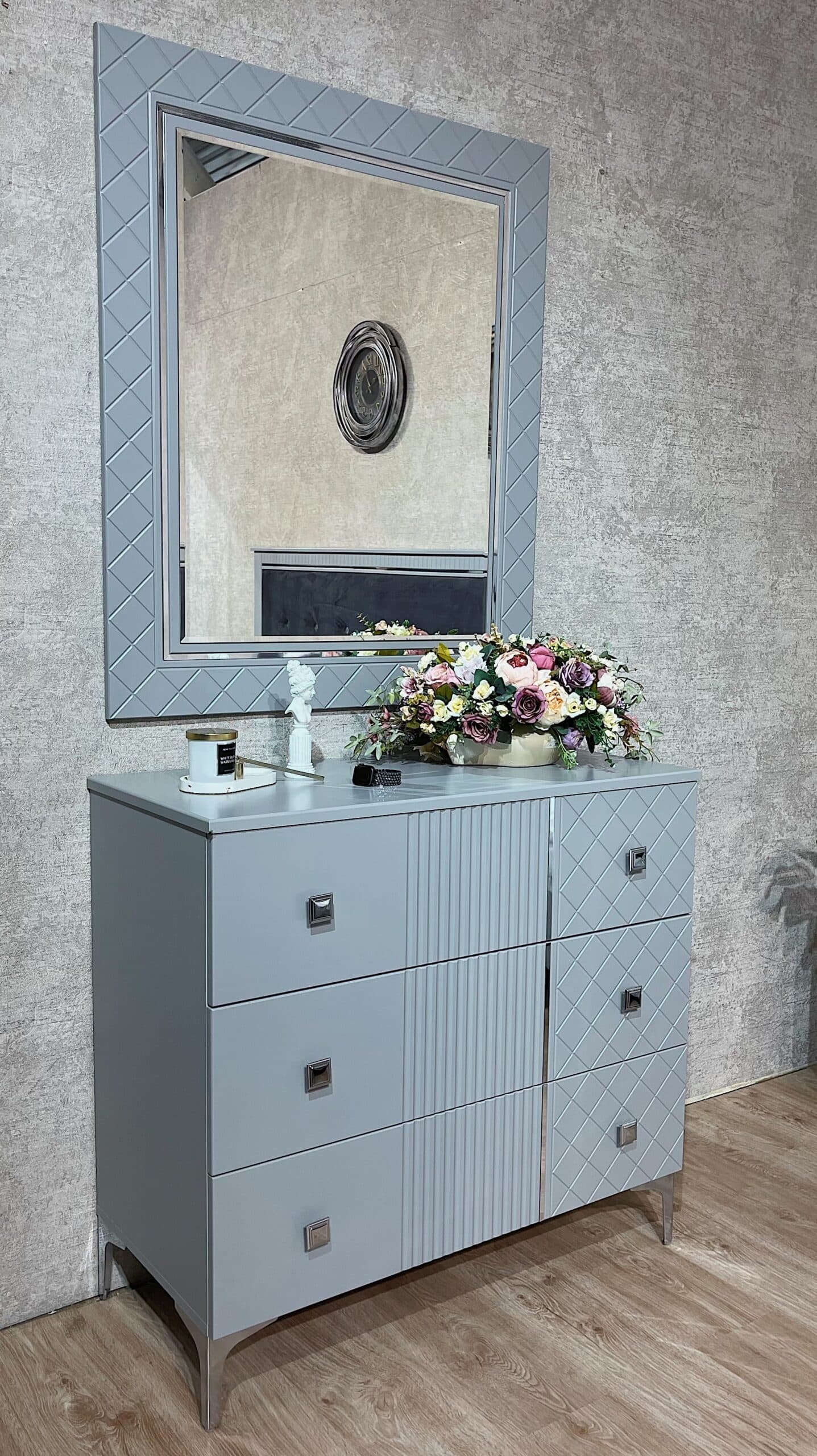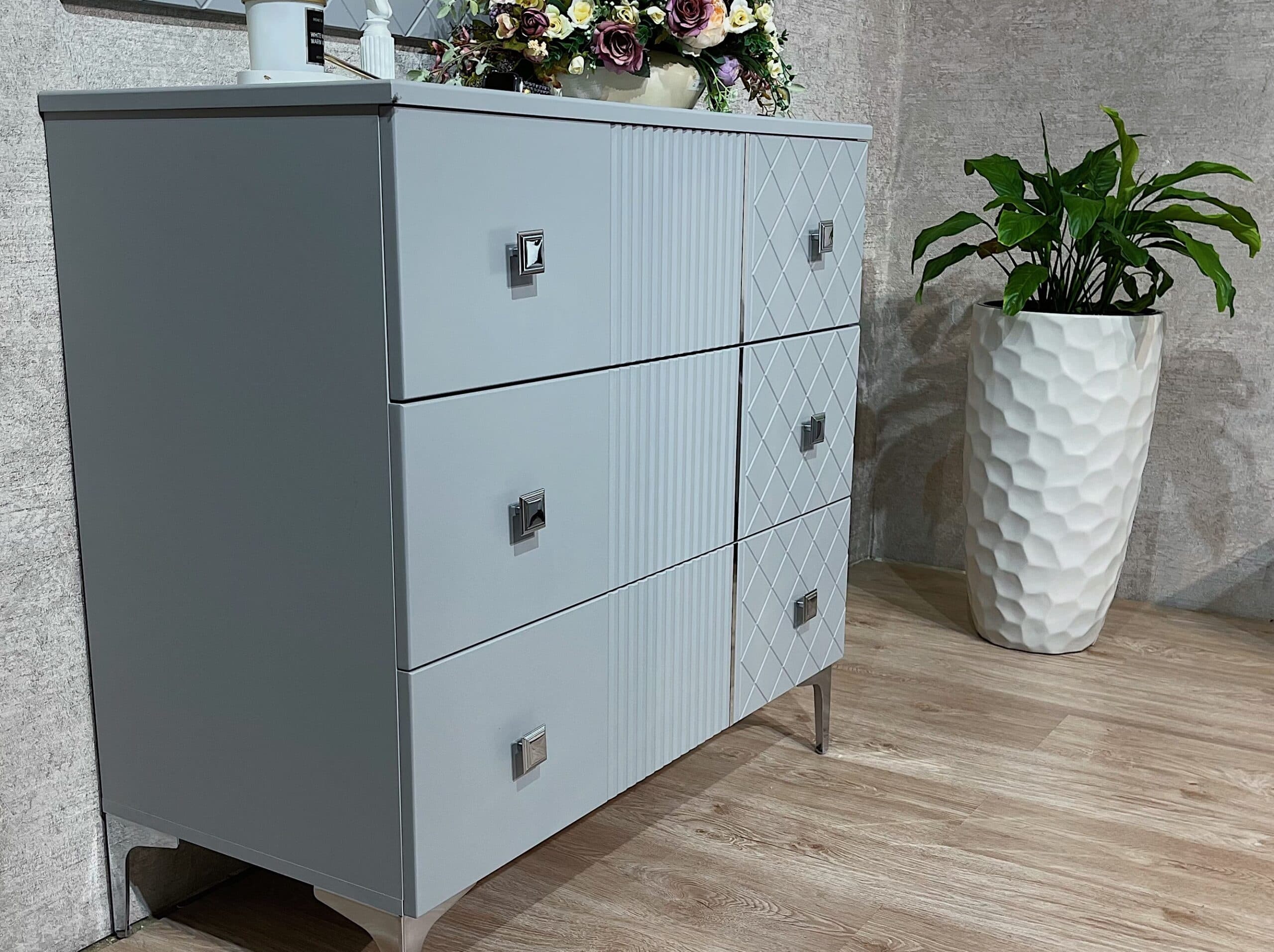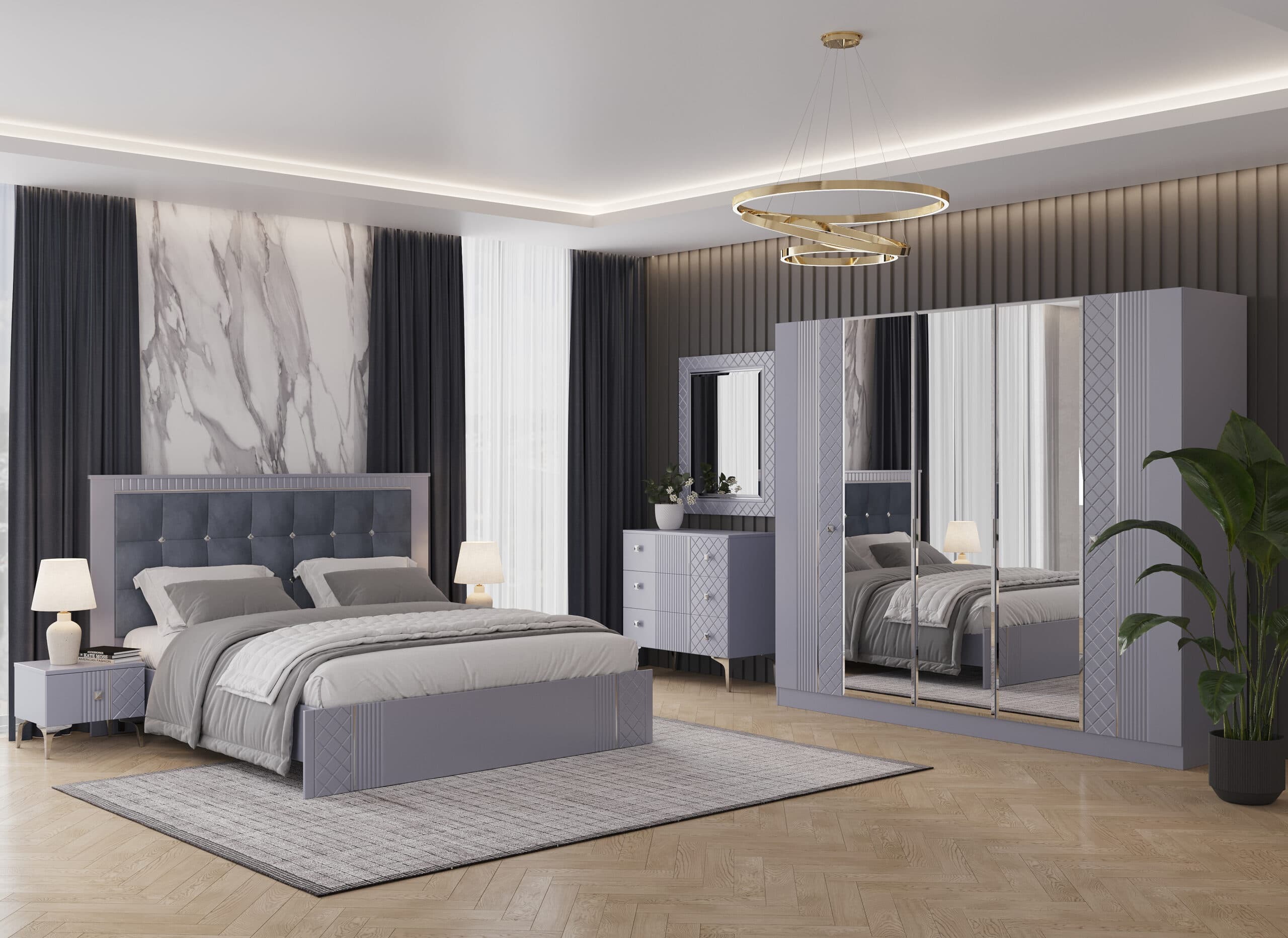 Современная коллекция мебели «Лаура» серо- серебристых оттенков — идеальный выбор для вашего интерьера! Мебель из ламинированного ДСП с фасадом прямого ЛМДФ цвета серый, украшенным изящной фрезеровкой, подчеркнёт ваш безупречный вкус. Мягкие изголовья кроватей из микровелюра создадут атмосферу комфорта, а зеркала шкафа и серебряный молдинг подарят ощущение элегантности и пространства. Удобные размеры шкафов, кровати, тумбы и комода позволяют гармонично вписать коллекцию в любой интерьер. Благодаря фурнитуре Boyard с доводчиками использование коллекции станет максимально комфортным и приятным.