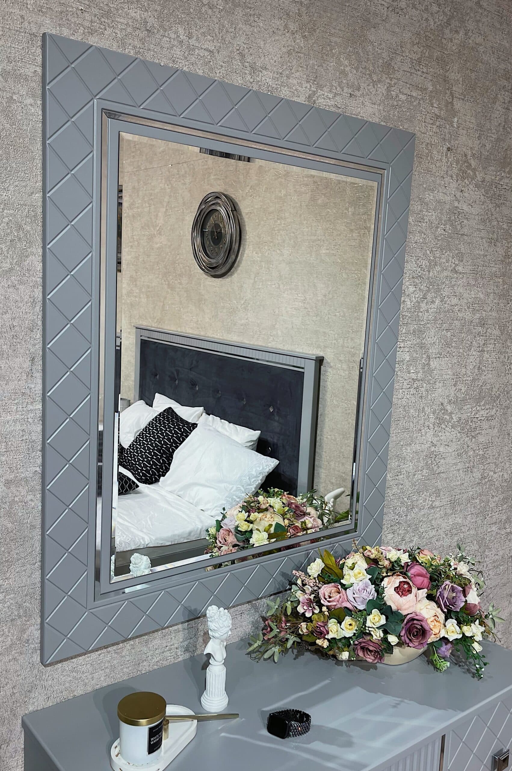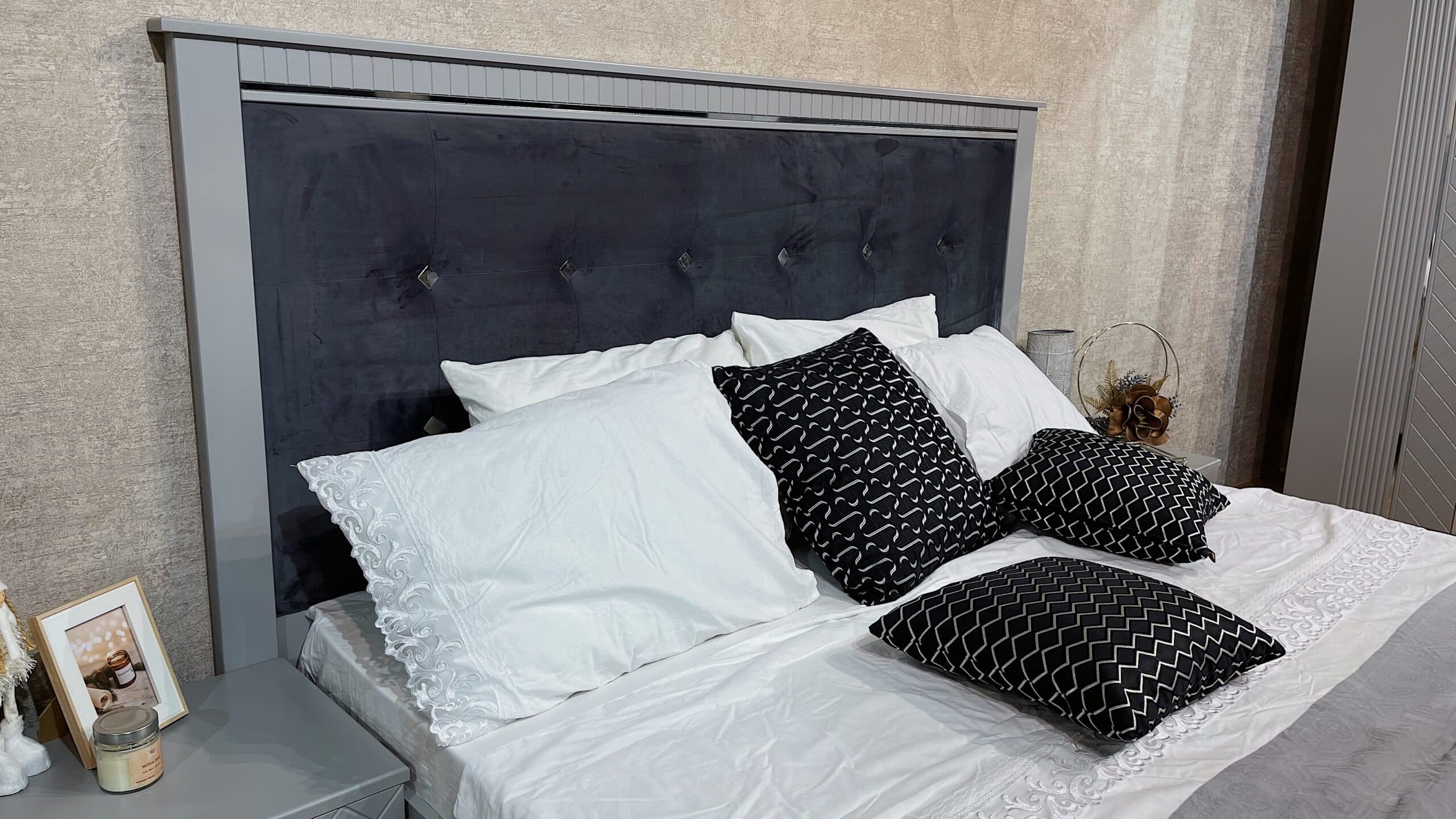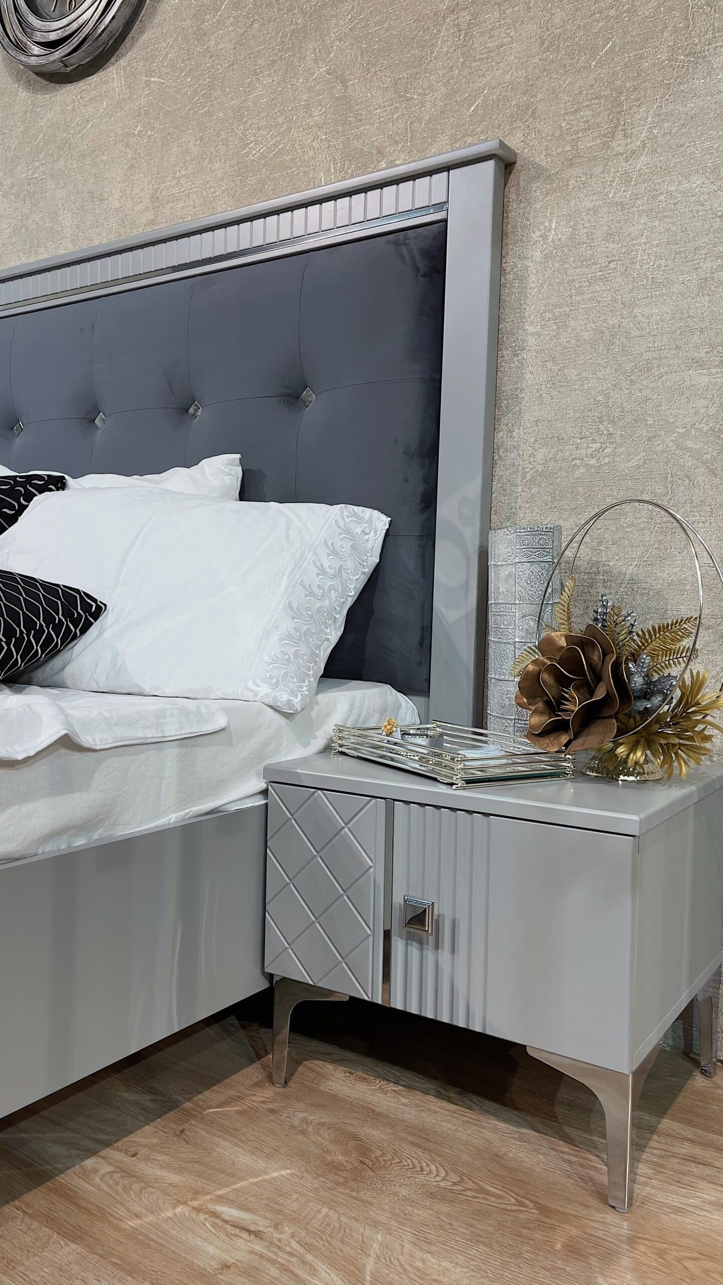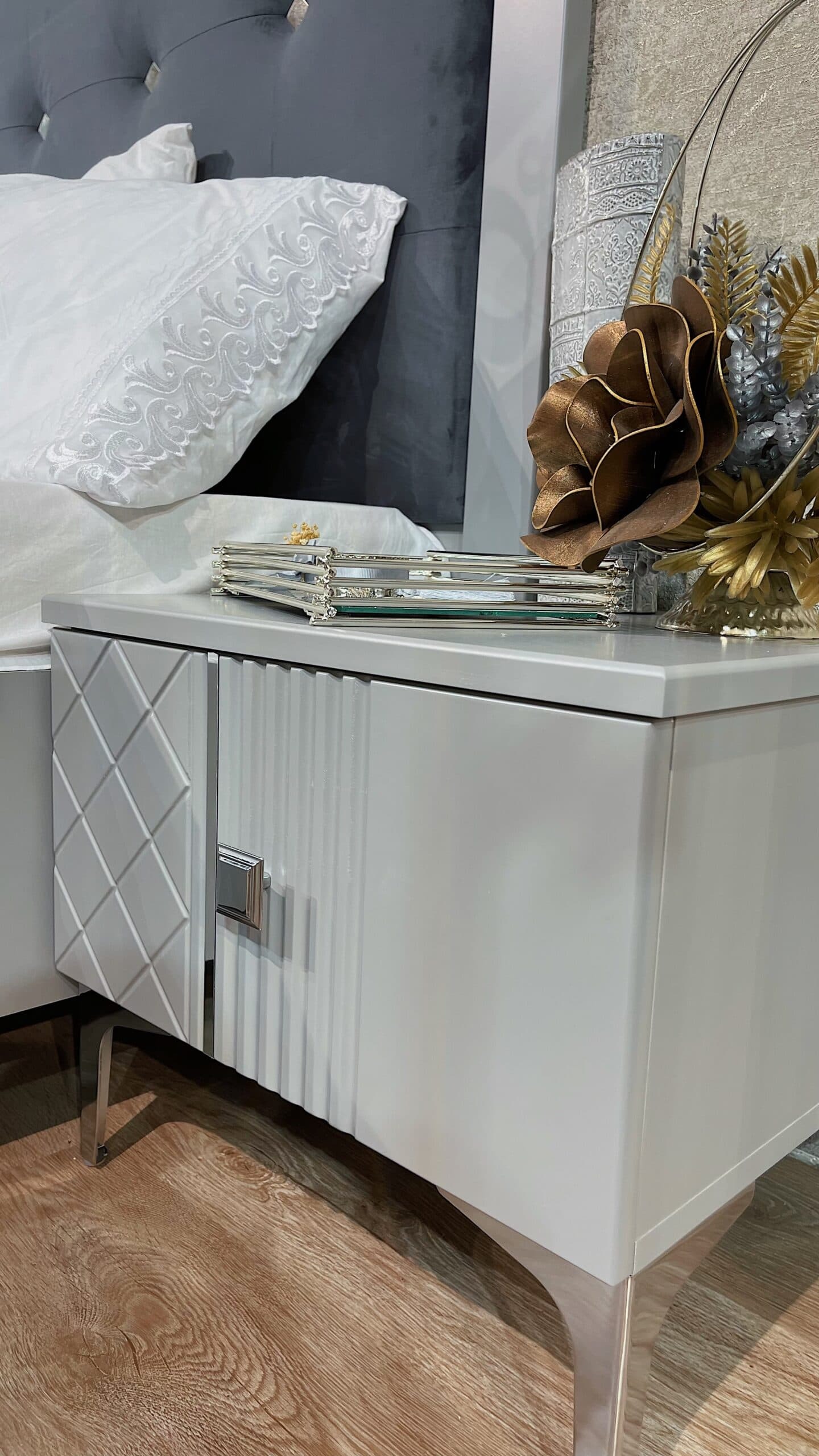 Современная коллекция мебели «Лаура» серо- серебристых оттенков — идеальный выбор для вашего интерьера! Мебель из ламинированного ДСП с фасадом прямого ЛМДФ цвета серый, украшенным изящной фрезеровкой, подчеркнёт ваш безупречный вкус. Мягкие изголовья кроватей из микровелюра создадут атмосферу комфорта, а зеркала шкафа и серебряный молдинг подарят ощущение элегантности и пространства. Удобные размеры шкафов, кровати, тумбы и комода позволяют гармонично вписать коллекцию в любой интерьер. Благодаря фурнитуре Boyard с доводчиками использование коллекции станет максимально комфортным и приятным.