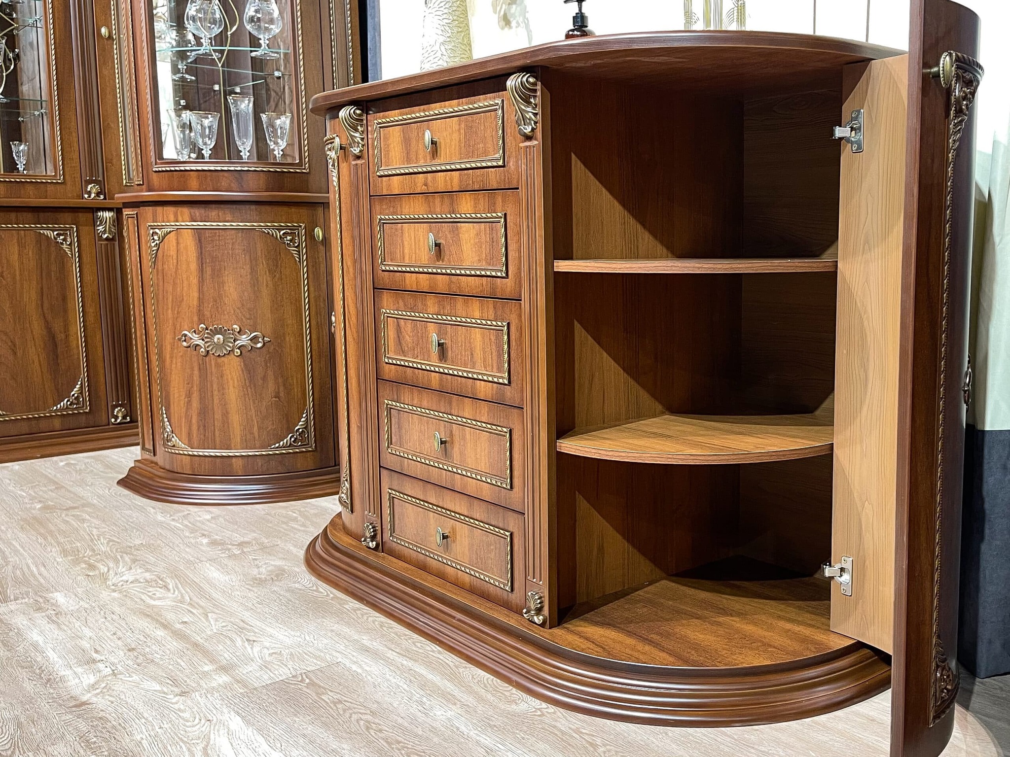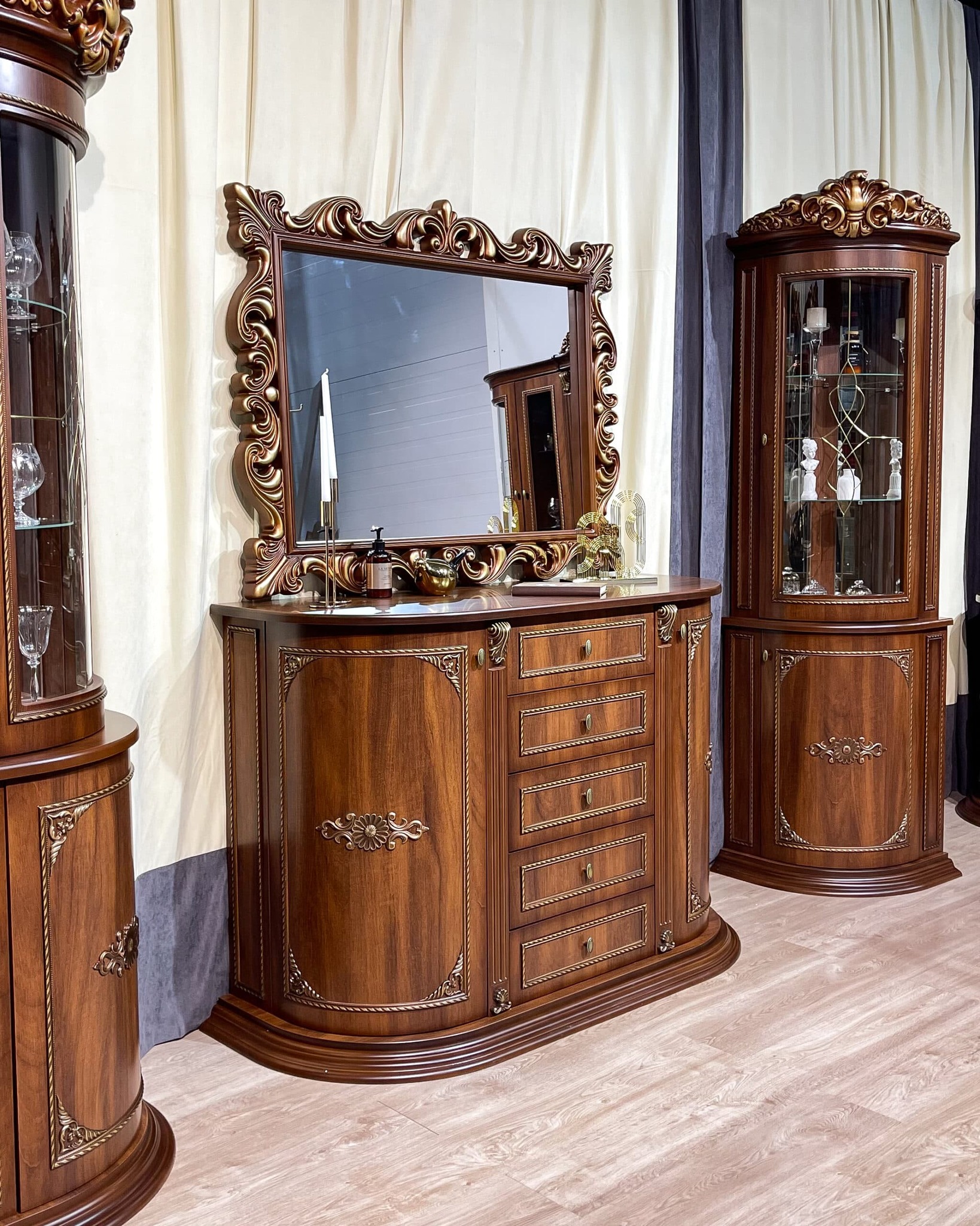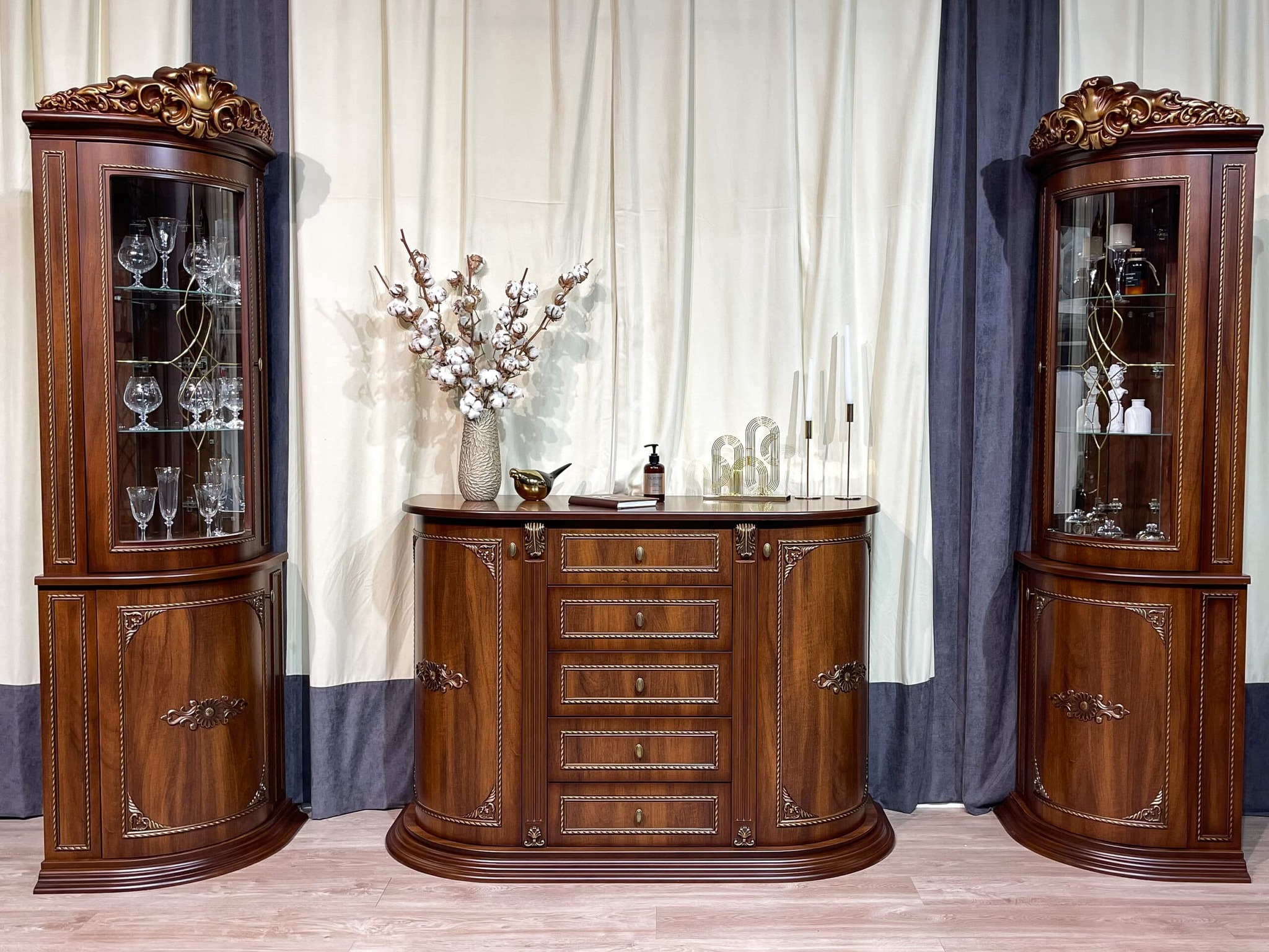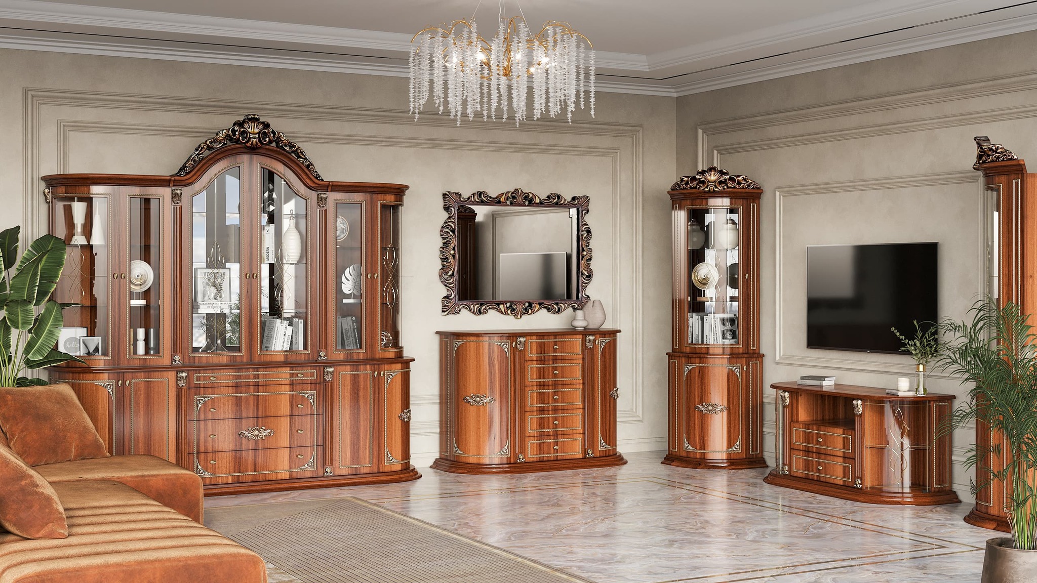 В комплект гостиной «Динара» входят вместительный сервант, две угловые секции, а также ТВ тумба, комод и зеркало.