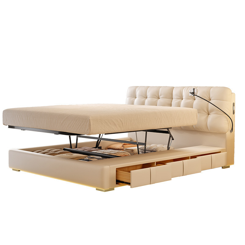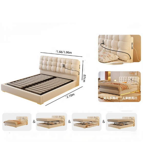 Откройте для себя идеальное сочетание комфорта и функциональности! Светлая кровать с подъемным механизмом – это не просто место для отдыха, но и удобный способ хранения благодаря вместительным ящикам под матрасом. Удобная USB-зарядка всегда будет рядом, чтобы ваш гаджет никогда не разряжался. Ночная лампа и подсветка создадут атмосферу уюта и тепла. Это именно та мебель, которая сделает вашу спальню стильной и современной!