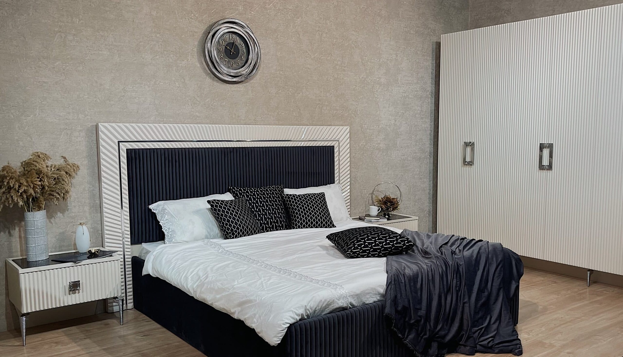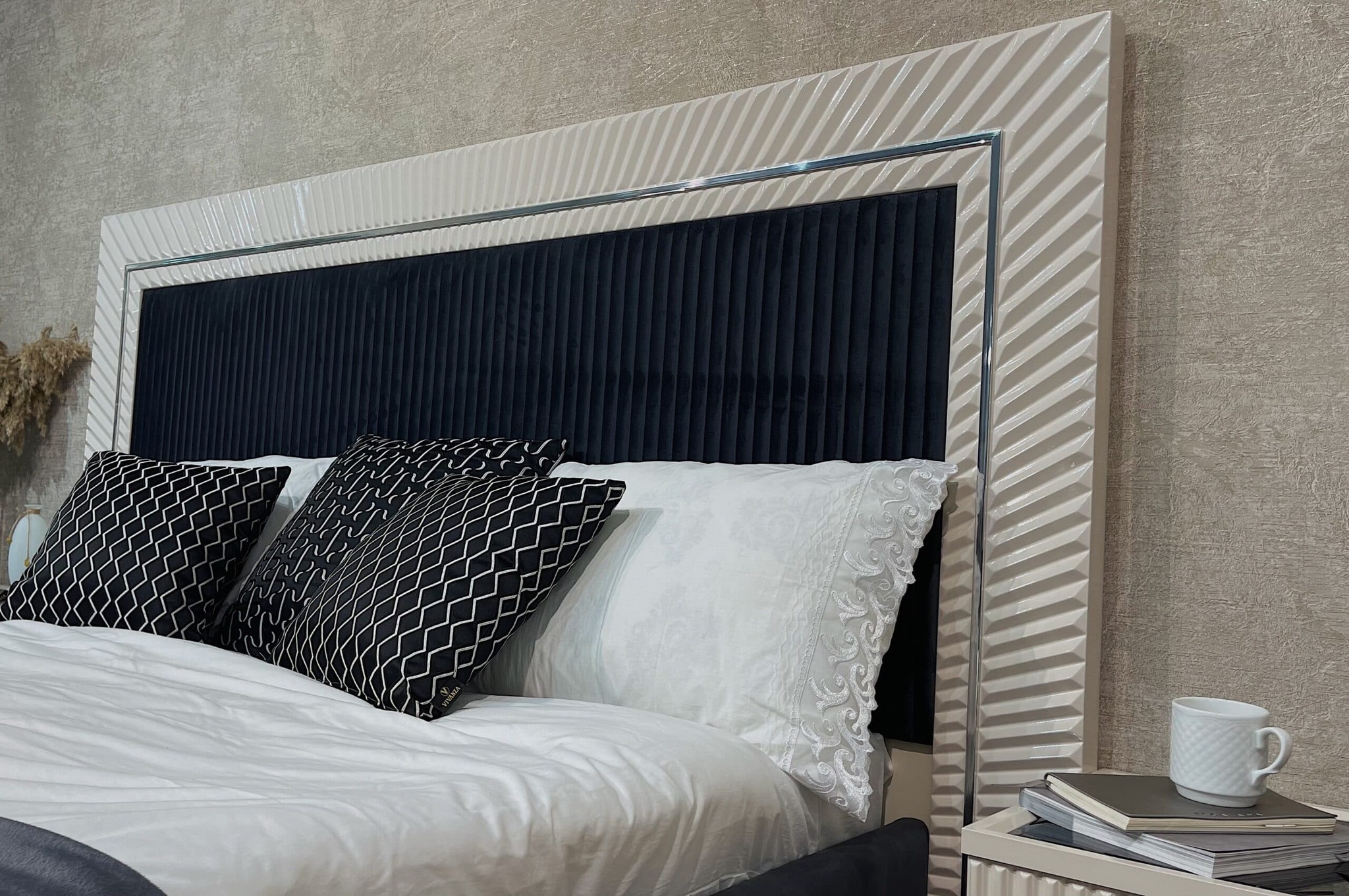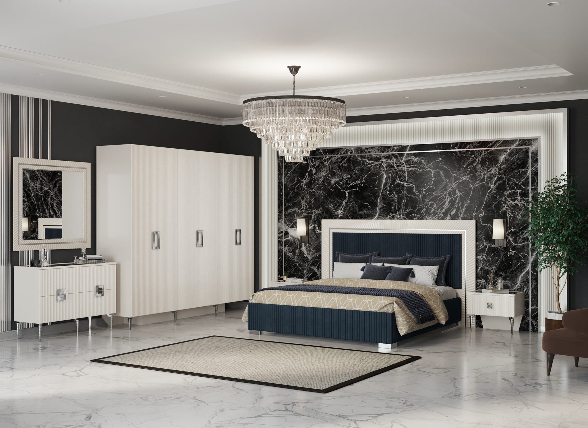 Откройте для себя комфортную спальню с кроватью "Измир" размером 1.8 метра! Мягкое изголовье из микро велюра глубокого синего оттенка гармонично сочетается с корпусом из ламинированного ДСП и роскошным молдингом зеркального серебра. Это идеальное сочетание стиля и функциональности!