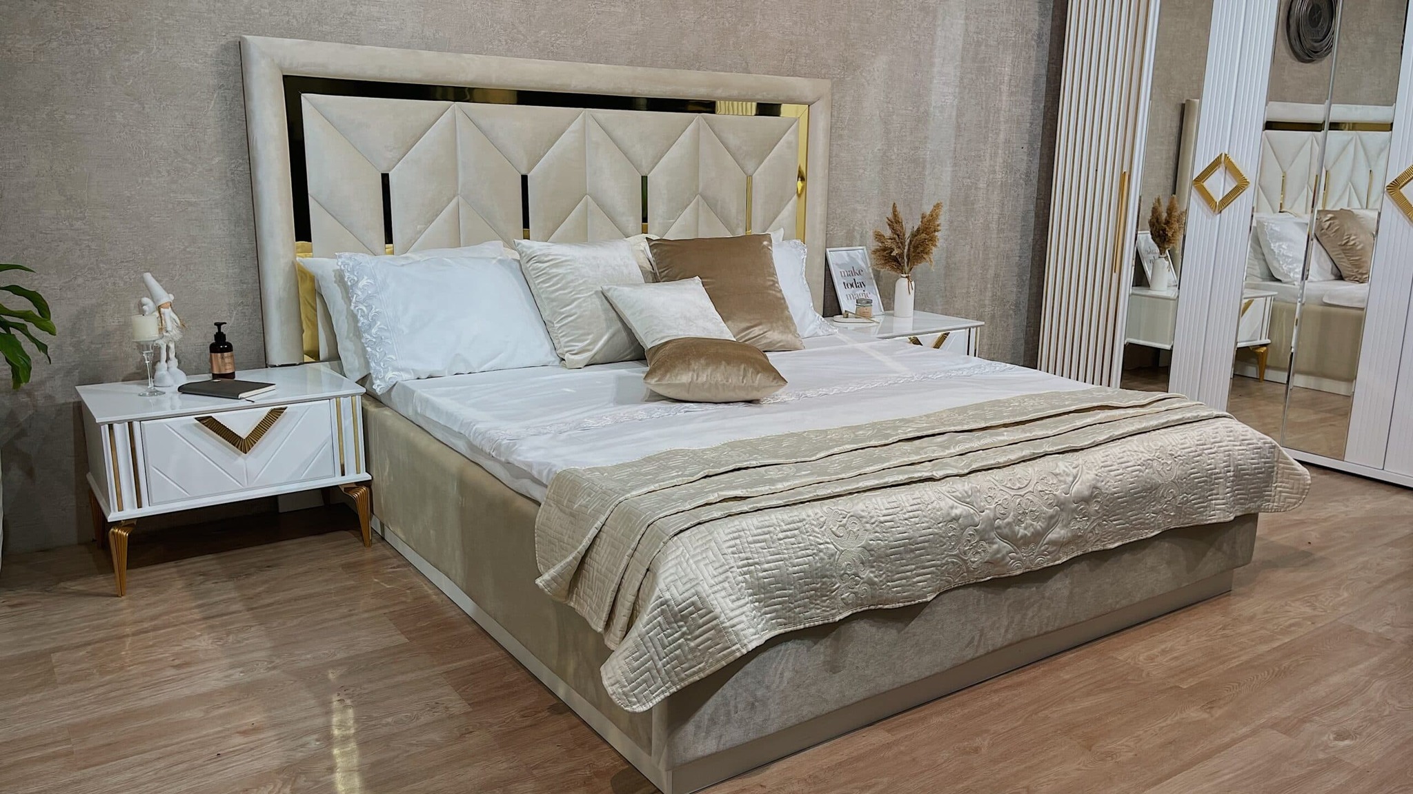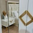 Шкаф 6-ти дверный – ш: 2600 мм, г: 650 мм, в: 2200 мм Кровать 1.8 стандарт – ш: 2244 мм, г: 2037 мм, в: 1457 мм Кровать 1.8 с подъемным механизмом – ш: 2244 мм, г: 2037 мм, в: 1457 мм Тумба – ш: 670 мм, г: 450 мм, в: 480 мм Комод – ш: 1426 мм, г: 450 мм, в: 903 мм Зеркало – ш: 900 мм, г: 20 мм, в: 1040 мм