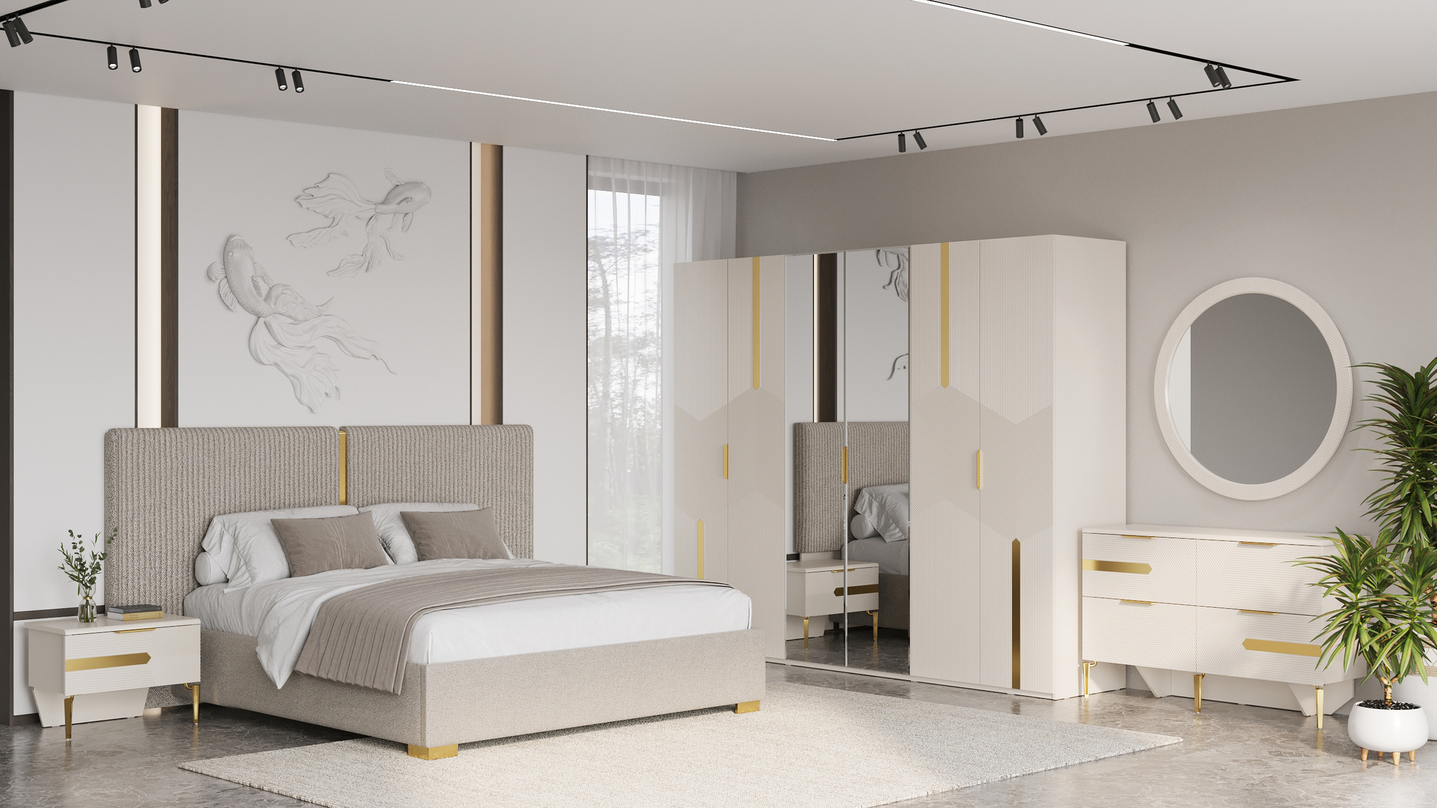 Шкаф 6-ти дверный ш: 2704 мм, г: 600мм, в: 2240 мм Шкаф 4-х дверный ш: 1802 мм, г: 600мм, в: 2240 мм Кровать 1.8 ш: 2440 мм, г: 2150 мм, в: 1320 мм Кровать 1.6 ш: 2240 мм, г: 2150 мм, в: 1320 мм Тумба ш: 635 мм, г: 398 мм, в: 470 мм Комод ш: 1274мм, г: 438 мм, в: 828 мм Зеркало ш: 1060 мм, г: 20 мм, в: 1060 мм