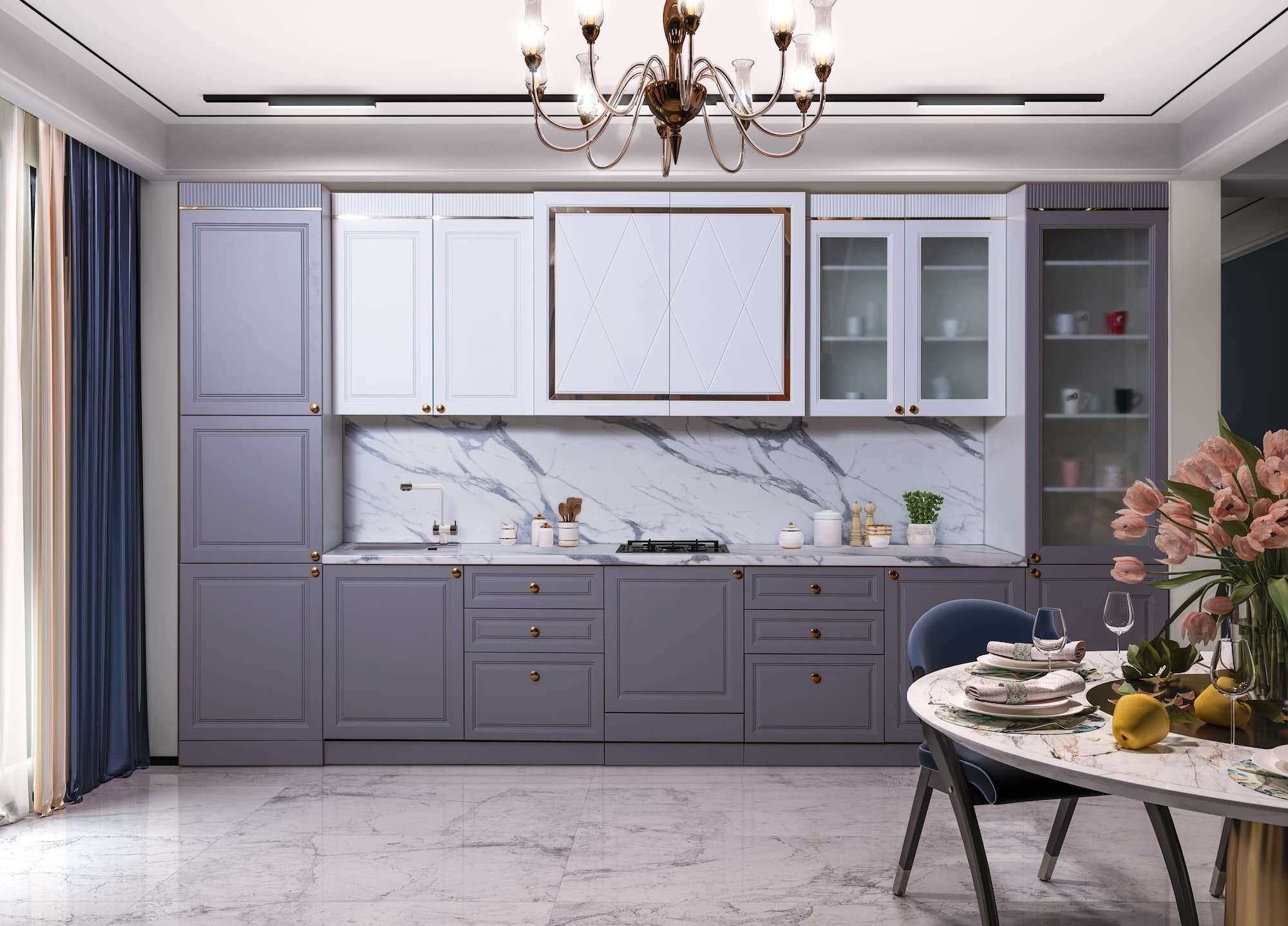 Элегантный кухонный гарнитур «Лючия» в контрастном бело-сером исполнении. Лаконичные глянцевые белые фасады создают ощущение чистоты и света. Динамику и современность дизайну придают строгие вертикальные серые ручки-рейлинги и матовый серый цоколь. Гарнитур отличается четкими линиями, сдержанной геометрией и продуманной эргономикой. Сочетание глянца и мата, белого и серого делает «Лючию» универсальным решением для создания стильного и практичного кухонного пространства.
