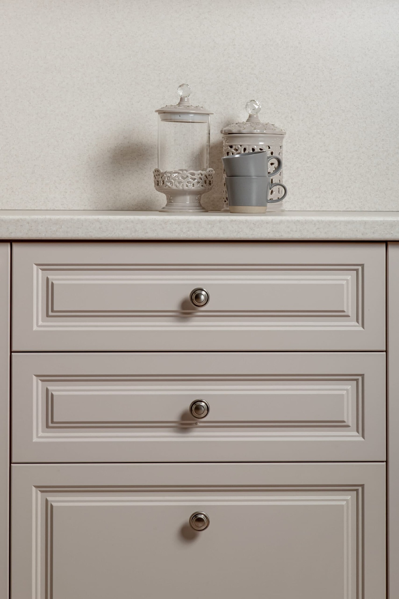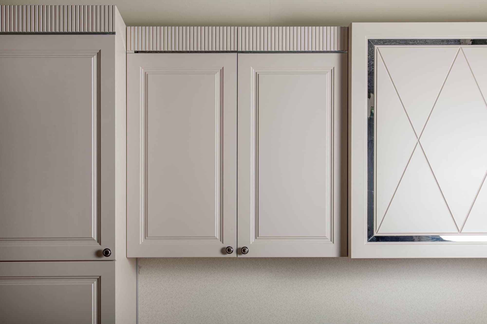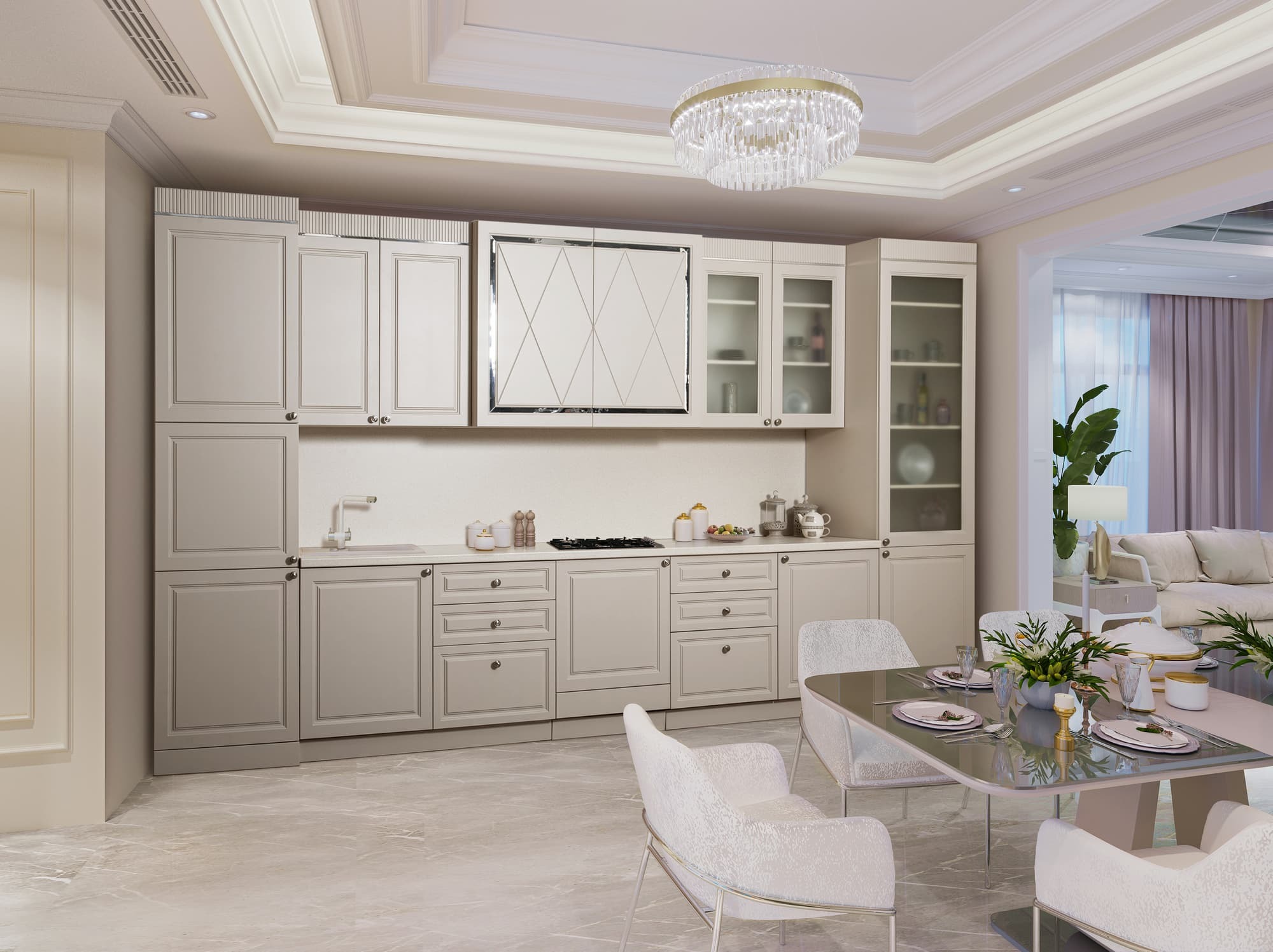 Классический кухонный гарнитур в кремовом цвете с изящной фрезеровкой, стеклянными вставками и декоративными элементами. Функциональная планировка включает удобные шкафы, ящики и открытую витрину. Светлая столешница и фартук придают элегантности. Идеальный выбор для создания уюта и роскоши на кухне.