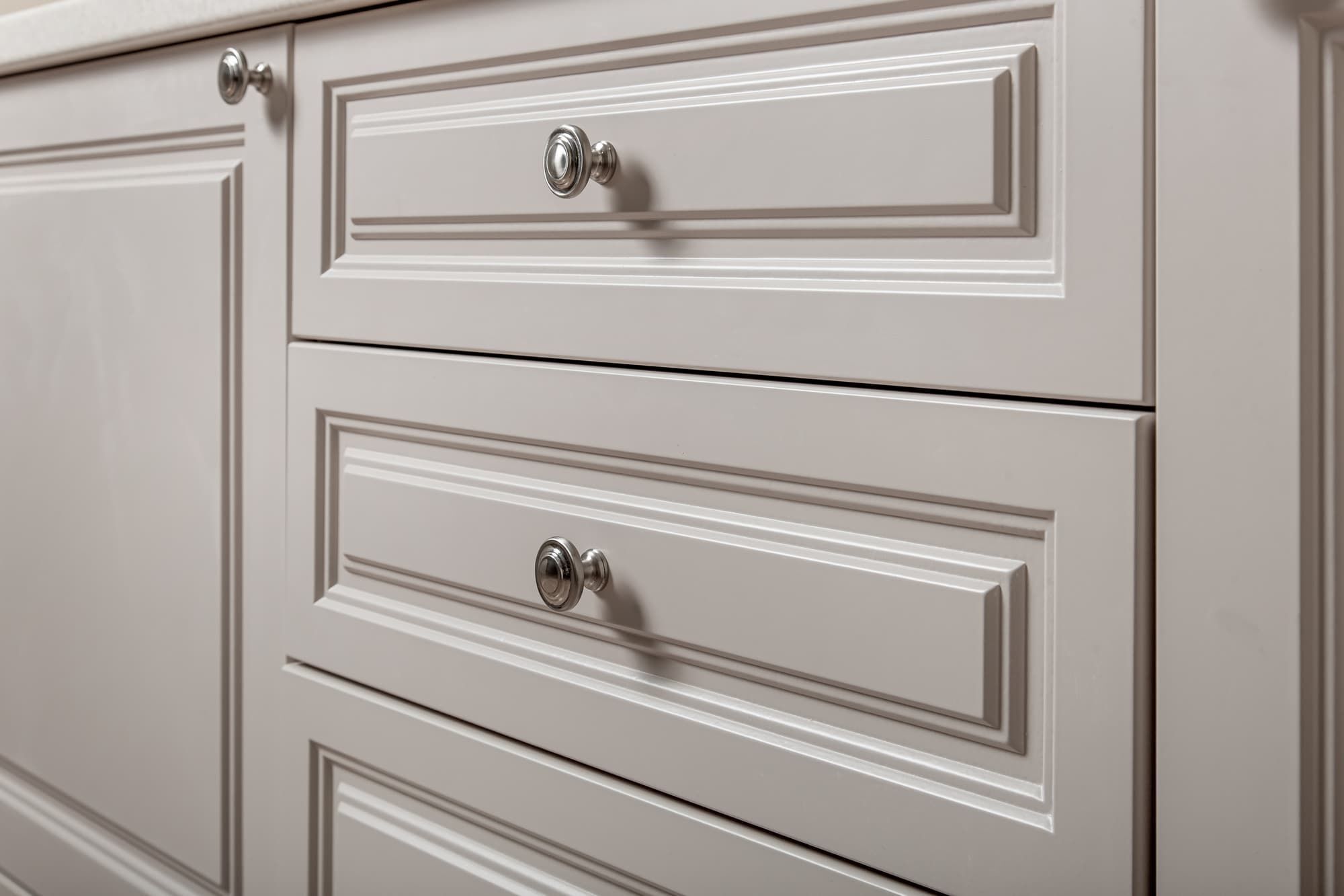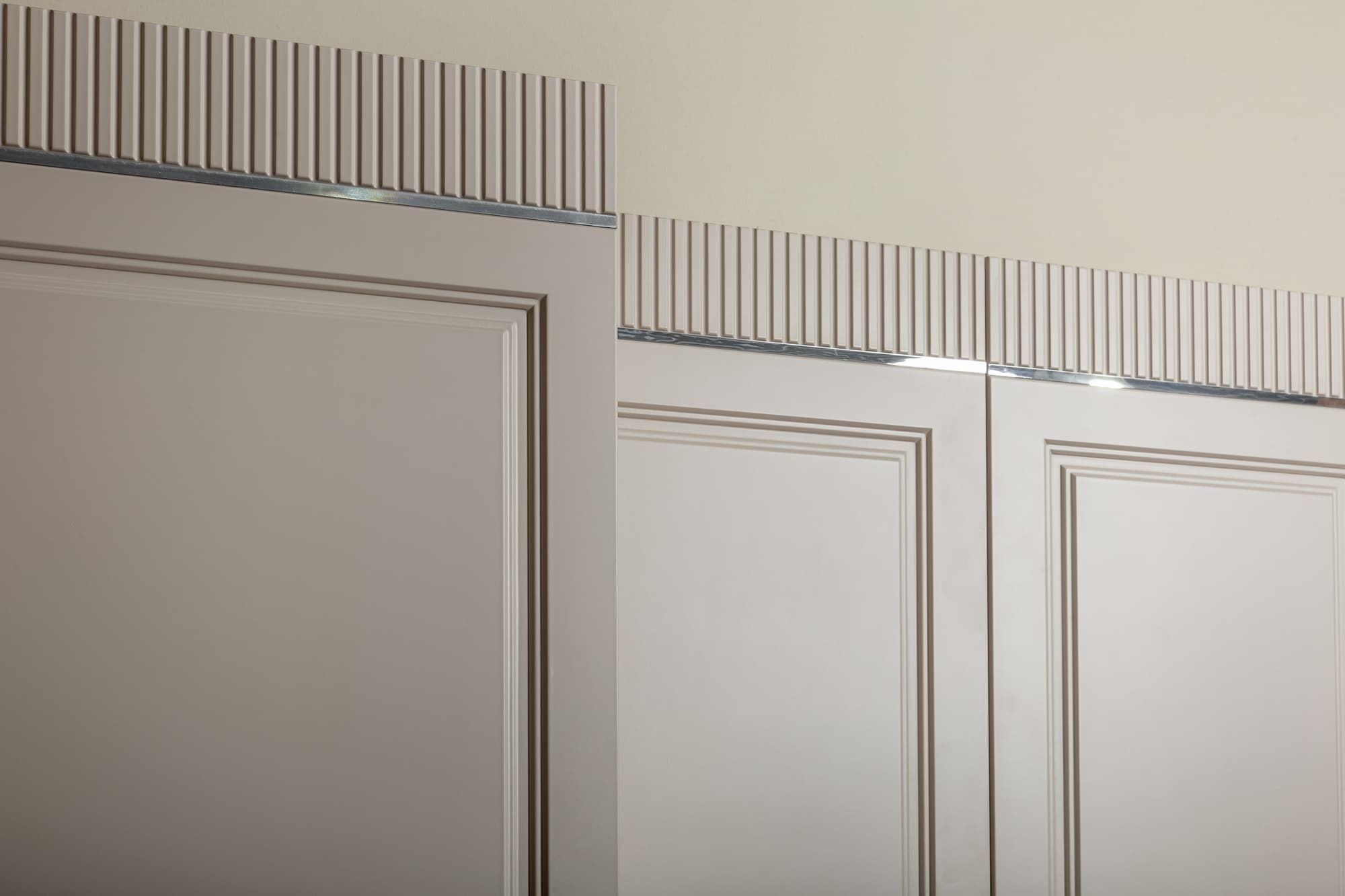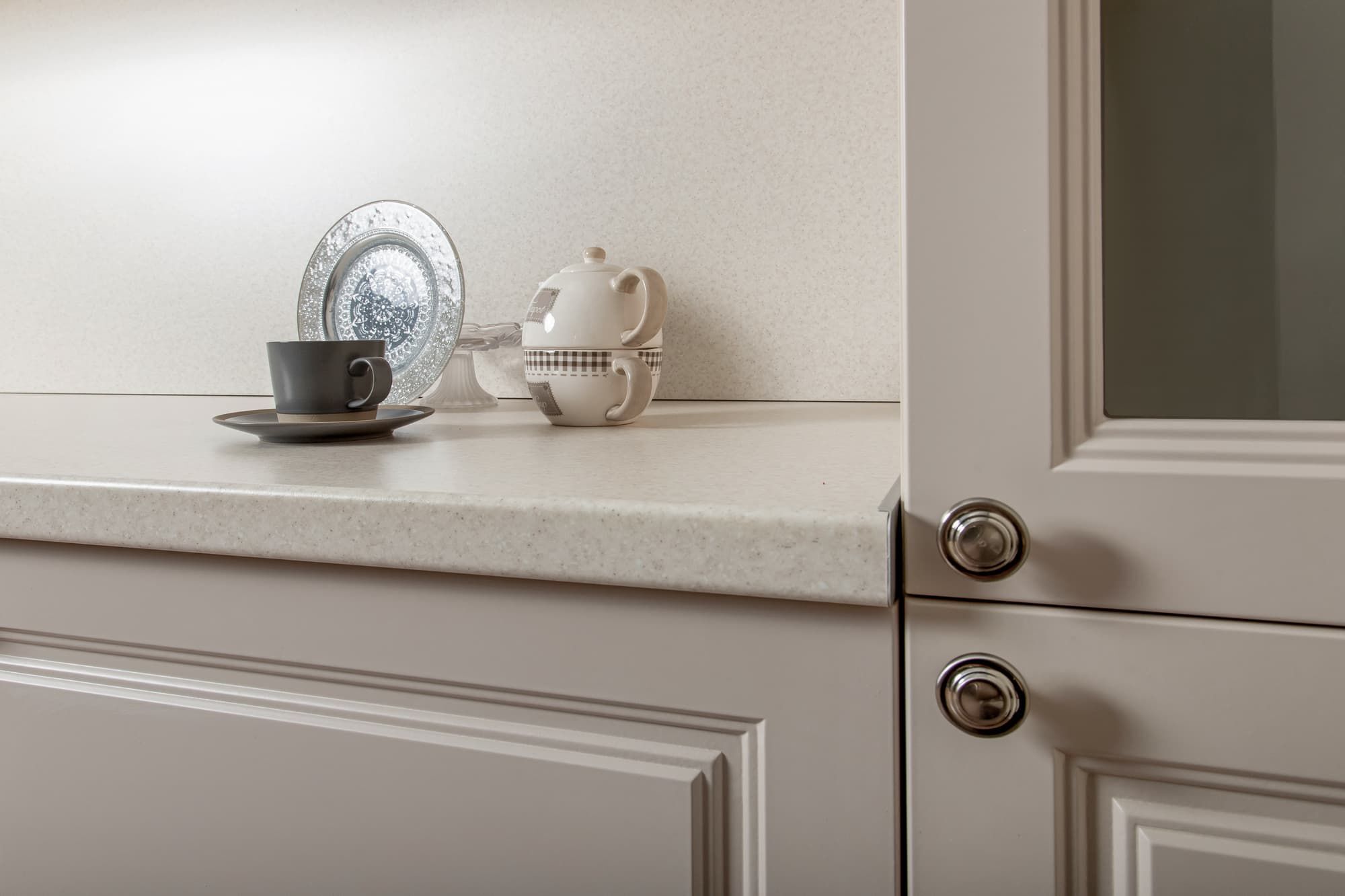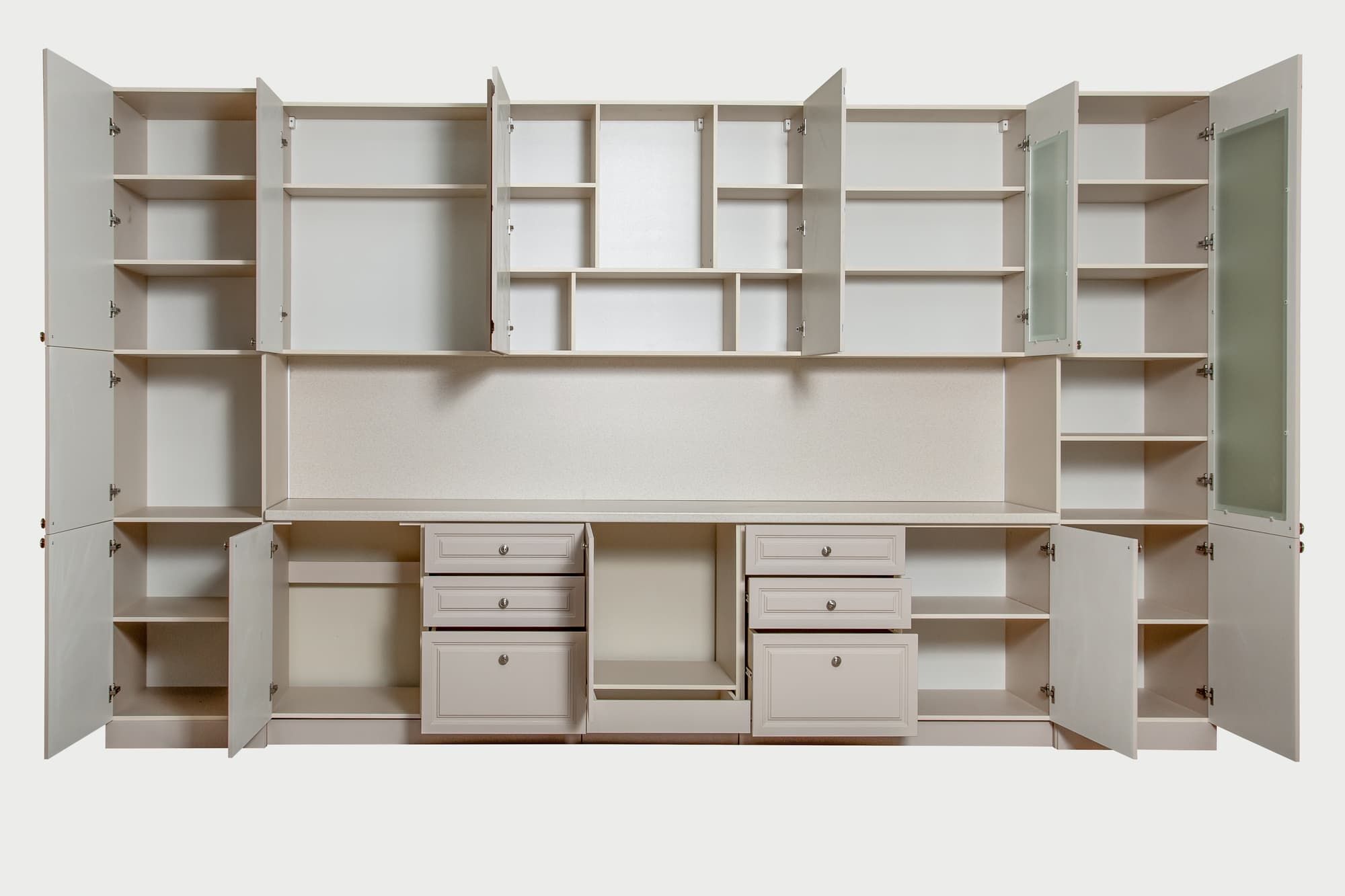 Классический кухонный гарнитур в кремовом цвете с изящной фрезеровкой, стеклянными вставками и декоративными элементами. Функциональная планировка включает удобные шкафы, ящики и открытую витрину. Светлая столешница и фартук придают элегантности. Идеальный выбор для создания уюта и роскоши на кухне.
