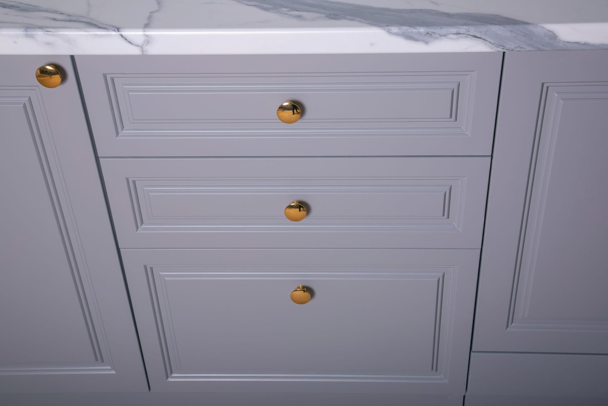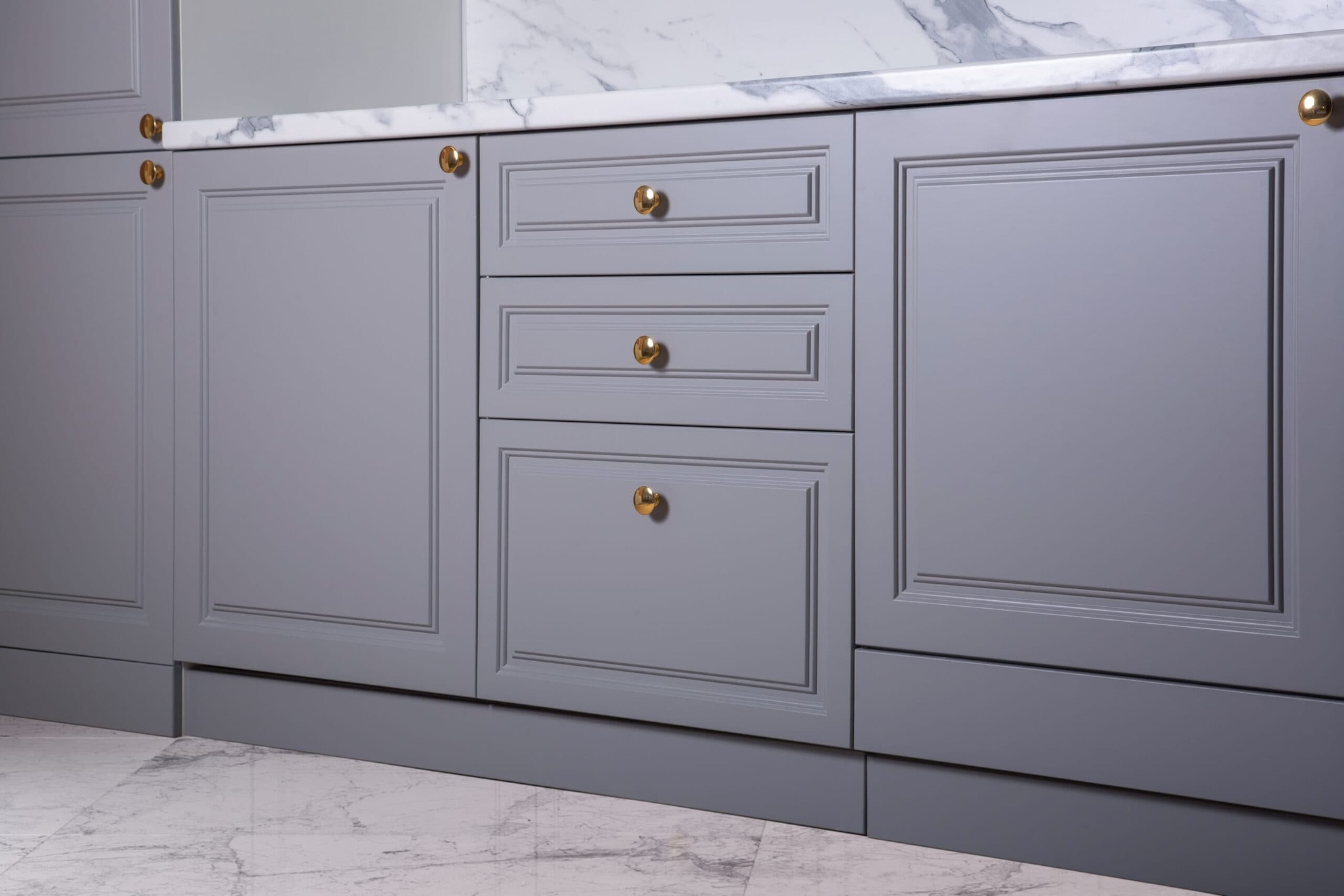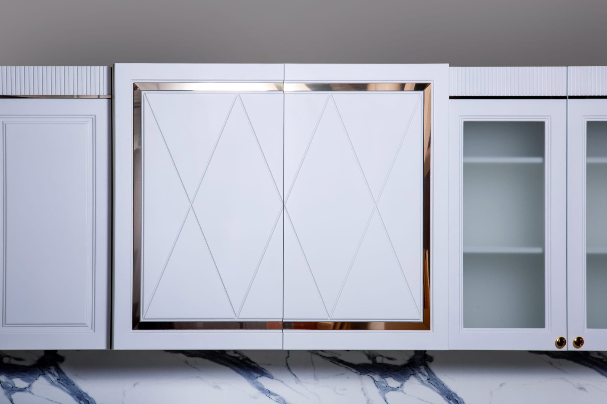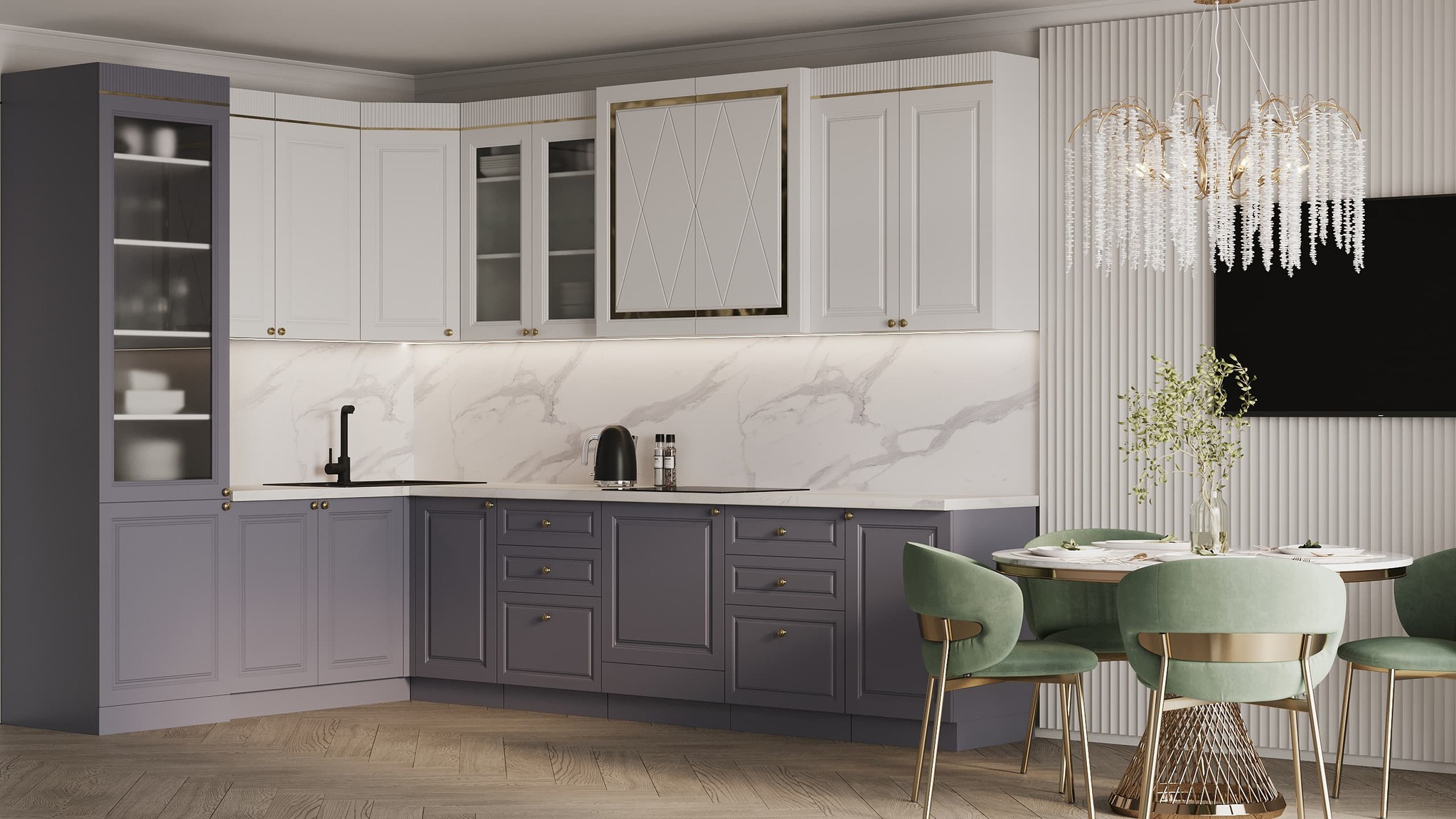 Угловая кухня «Лючия» в элегантном дуэте «Седая ночь» — идеальное сочетание серого и белого для современных интерьеров в стиле неоклассика или скандинавский минимализм. Фасады из матового ЛМДФ с тонкой фрезеровкой подчеркивают изысканность, а молдинги «зеркальное золото» добавляют теплый акцент.