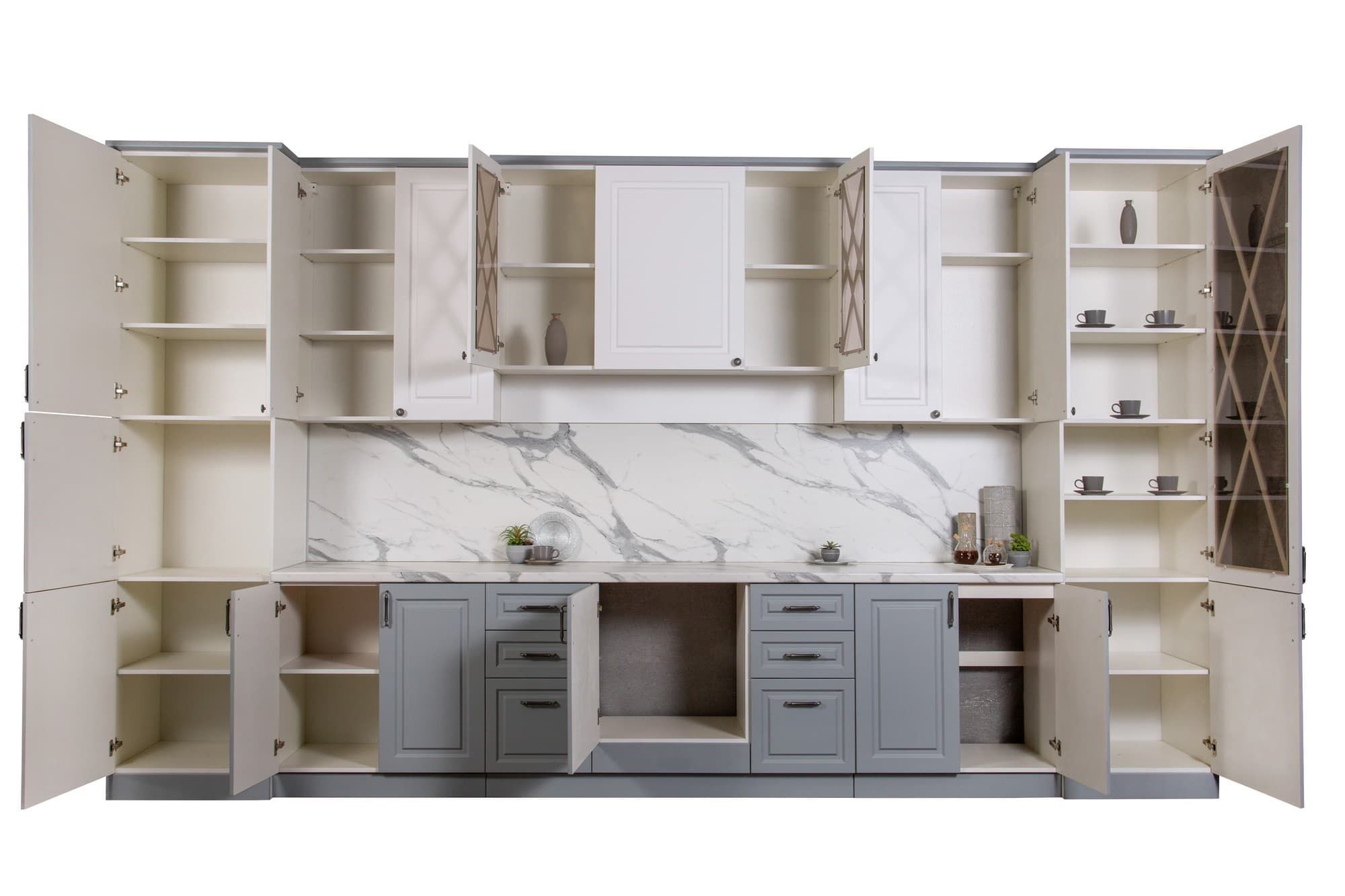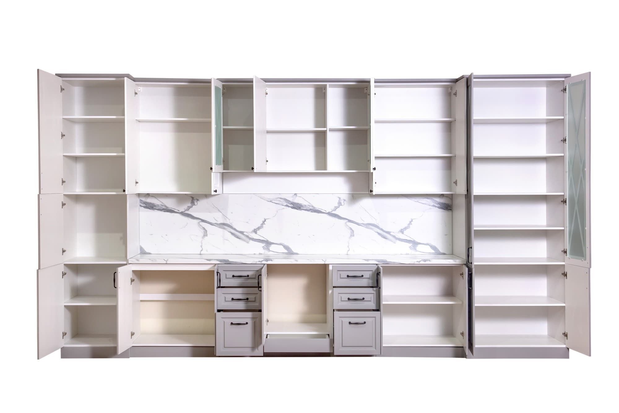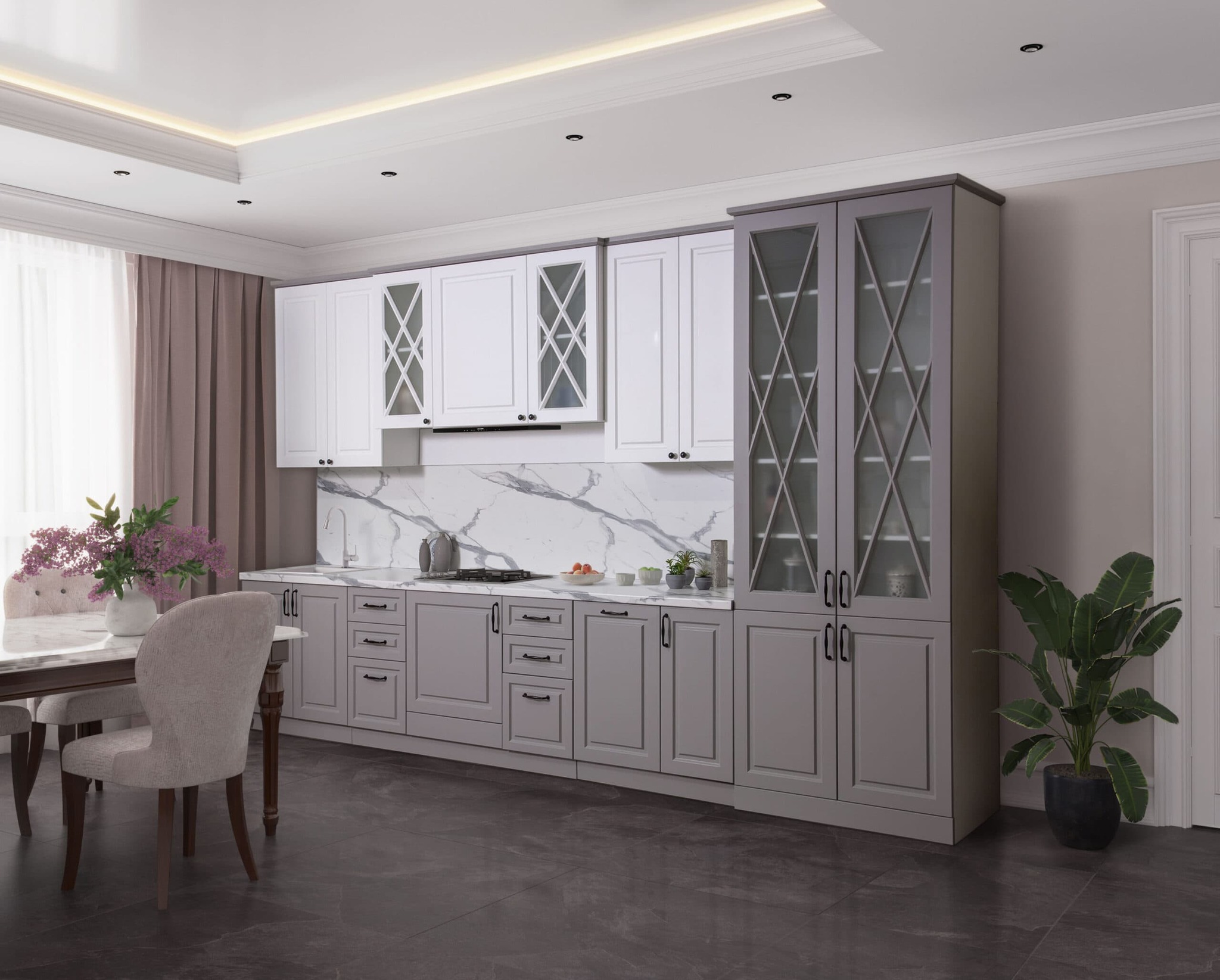 Кухня «Виктория» в элегантном цвете «Седая ночь» — это гармония серого и белого, дарящая пространству аристократичную глубину и свет. Идеальна для современного, скандинавского интерьера или лаконичного минимализма, где ценится чистота линий и спокойная палитра.