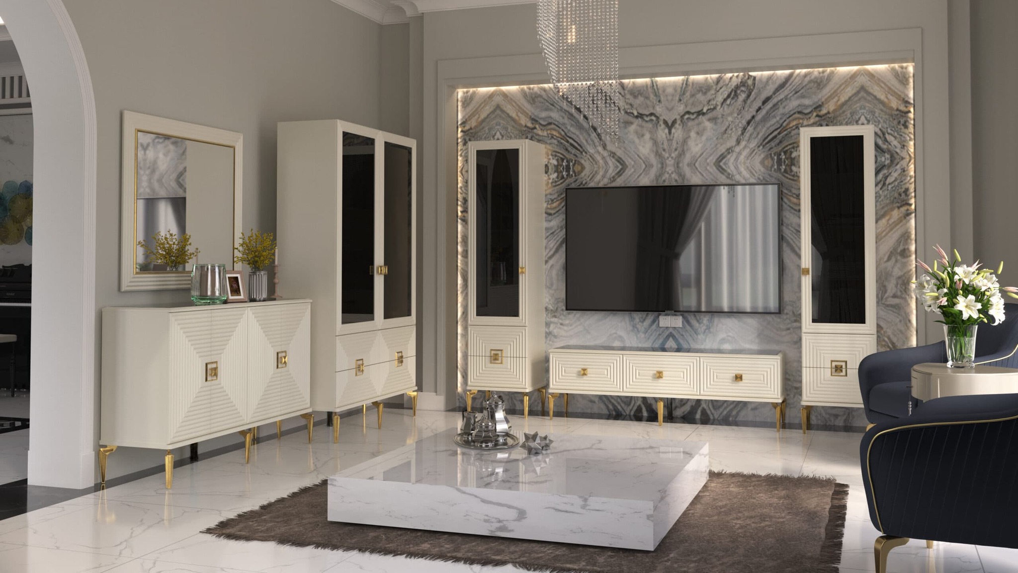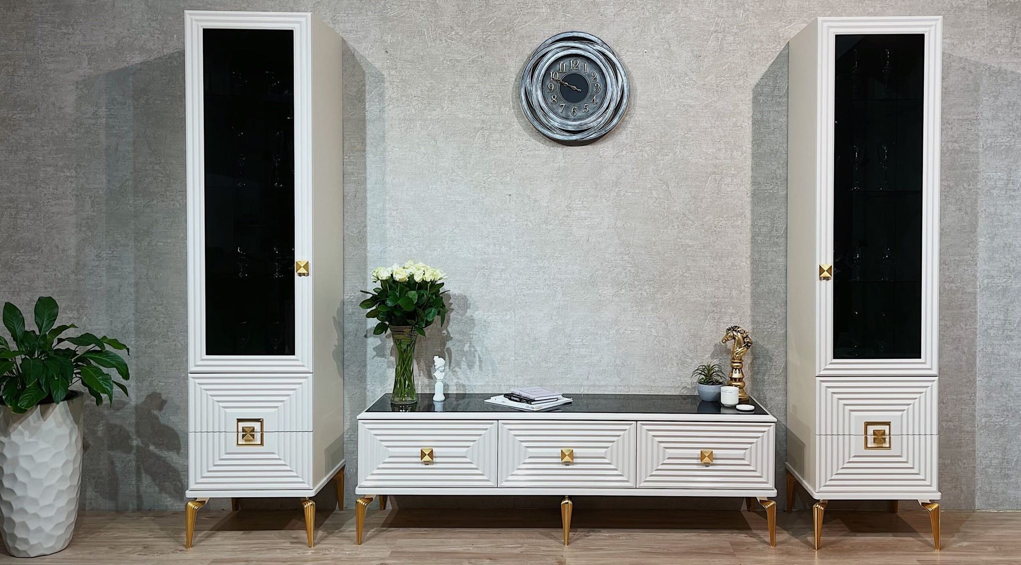 Гостиная “Алия” Золото – сочетание элегантности, утончённости и роскоши. Светлые оттенки в комбинации с золотыми акцентами придают интерьеру благородство и визуальную лёгкость. Фасады мебели украшены геометрическими узорами, создающими эффект глубины и объёма, а изящные ножки добавляют воздушность всей композиции. Эта коллекция идеально впишется в современный интерьер.