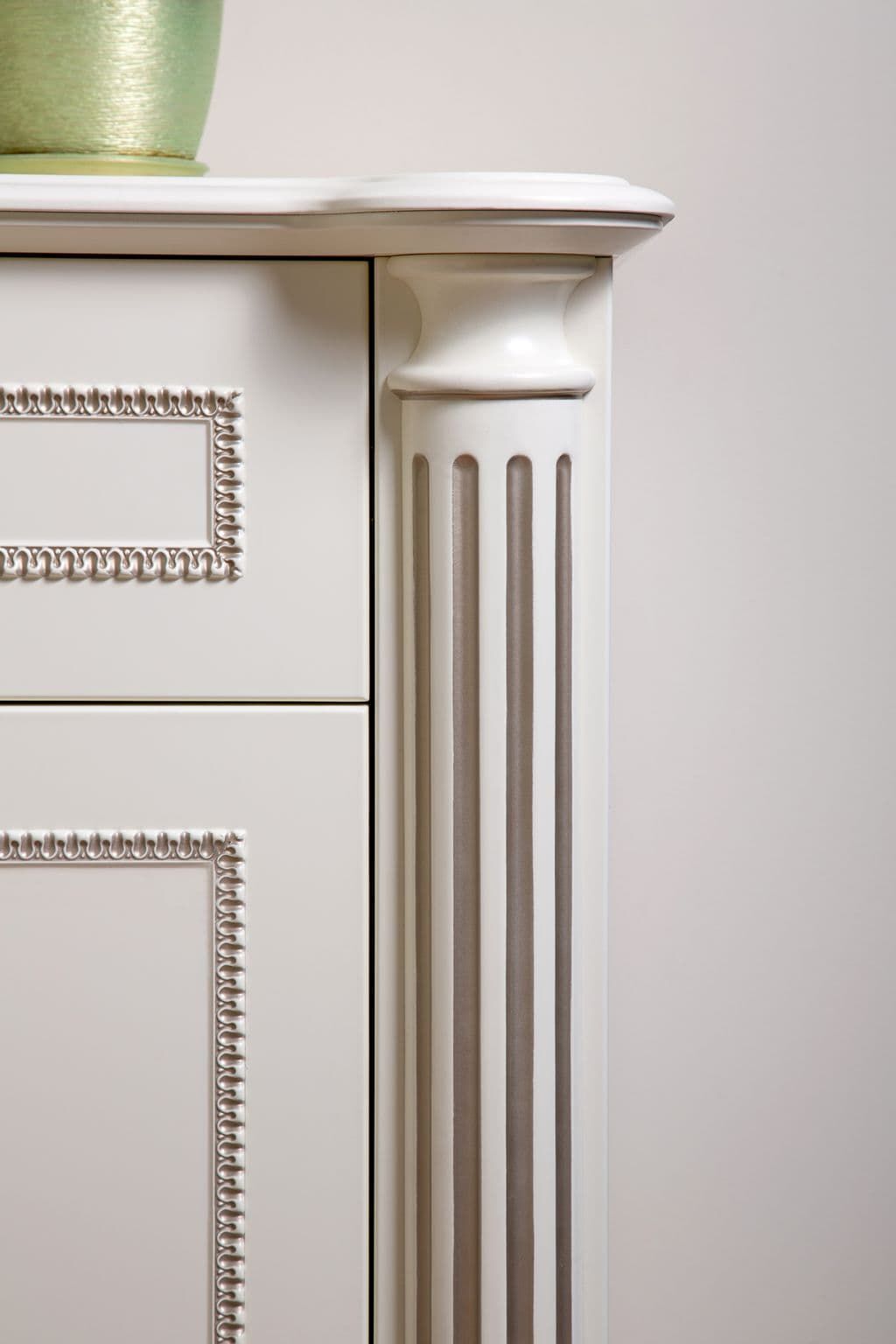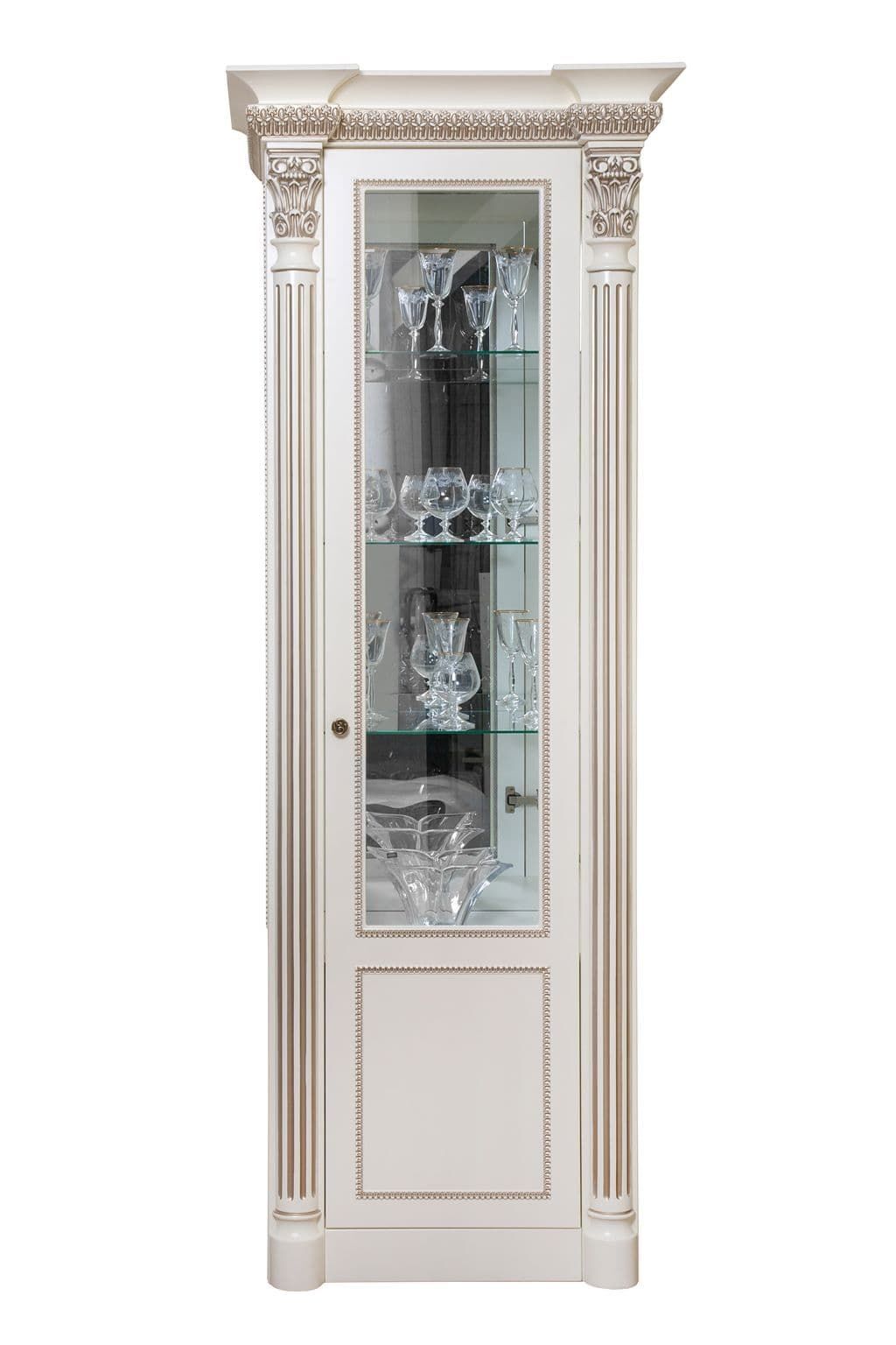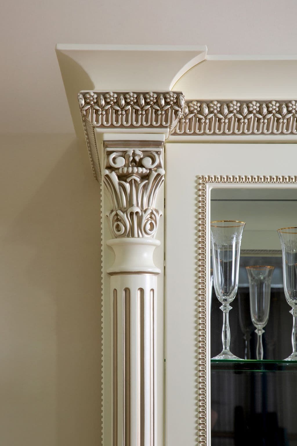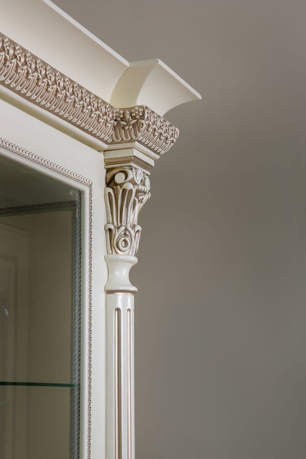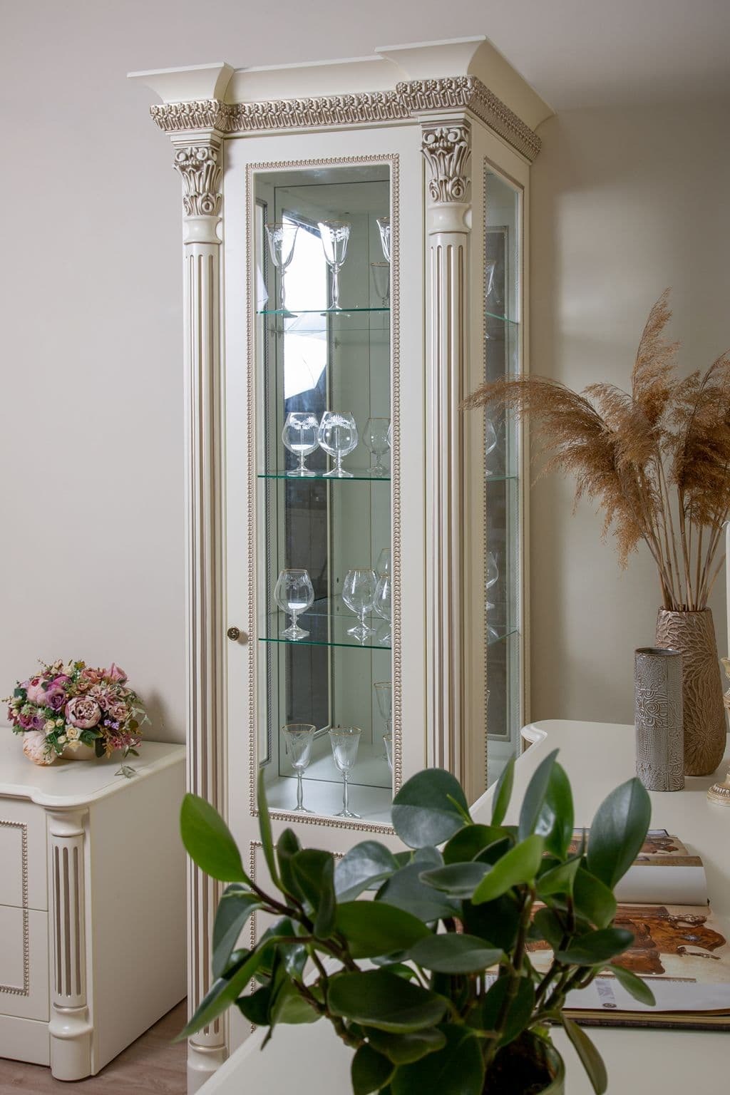 Элегантная гостиная в классическом стиле с изысканными витринами, резными фасадами и мягкой цветовой палитрой. Функциональные шкафы и тумбы обеспечивают удобство хранения, а натуральные материалы и гармоничные детали подчеркивают благородство интерьера. Декоративные элементы придают обстановке утонченность и уют.