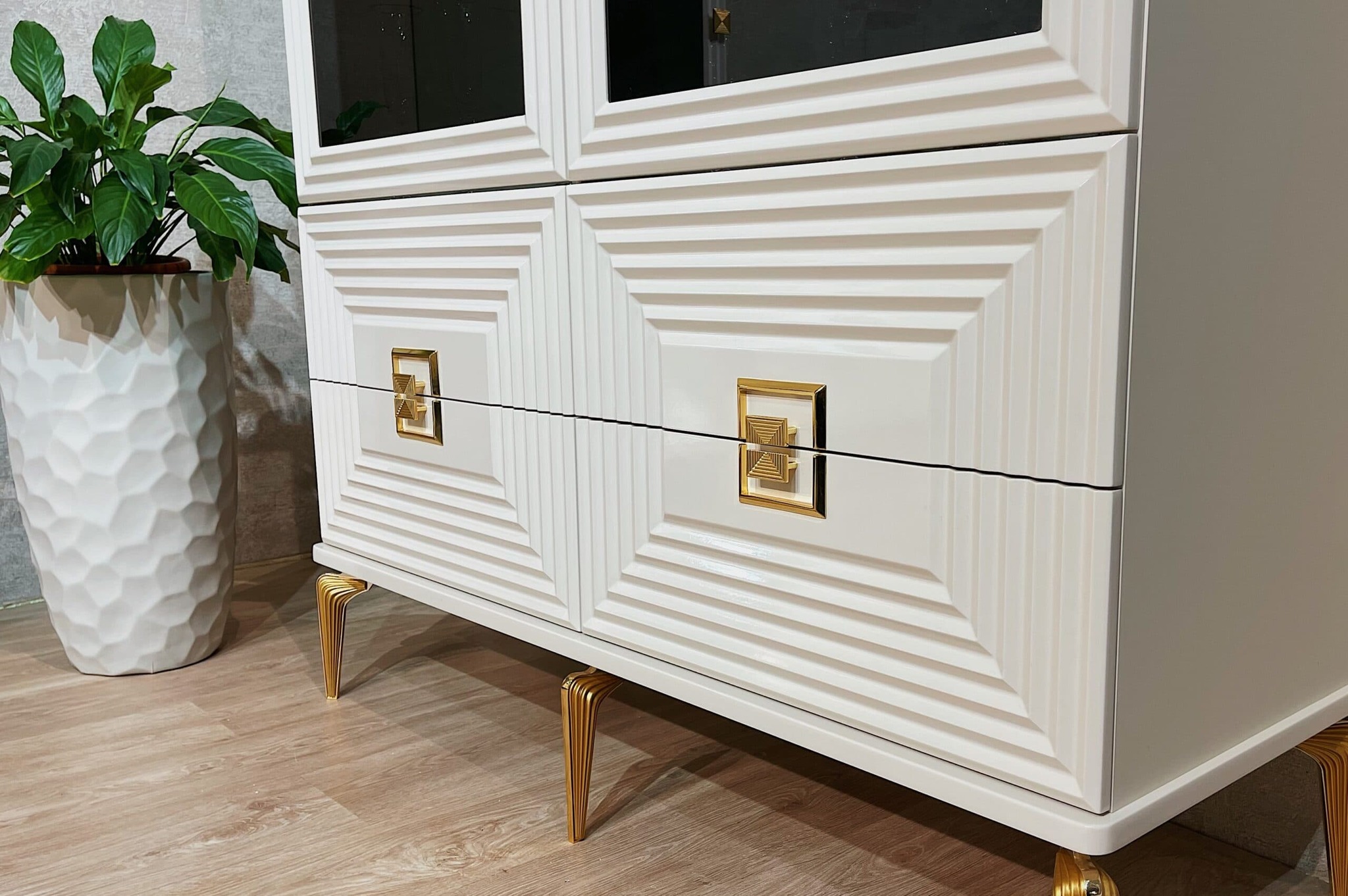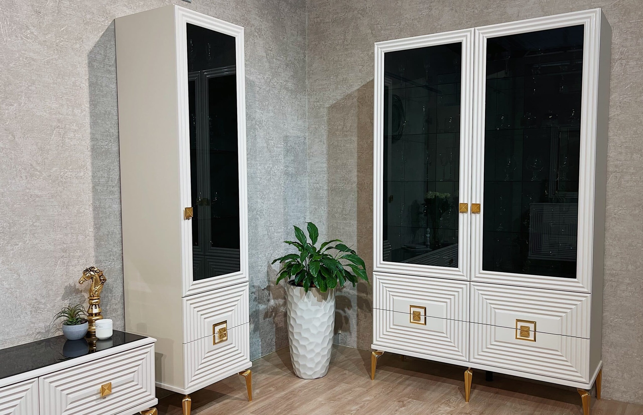 Гостиная “Алия” Золото – сочетание элегантности, утончённости и роскоши. Светлые оттенки в комбинации с золотыми акцентами придают интерьеру благородство и визуальную лёгкость. Фасады мебели украшены геометрическими узорами, создающими эффект глубины и объёма, а изящные ножки добавляют воздушность всей композиции. Эта коллекция идеально впишется в современный интерьер.