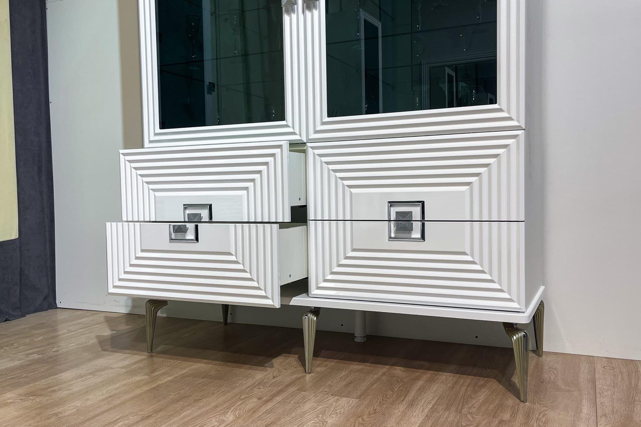 Гостиная “Алия” Серебро – Элегантность в холодных оттенках. Фасады мебели украшены рельефными узорами, создавая игру света и тени, а изящные металлические ножки добавляют легкости конструкции. Мягкий блеск серебра подчеркивает премиальность каждой детали. Идеальный выбор для интерьера, где сочетаются стиль, комфорт и утонченность.