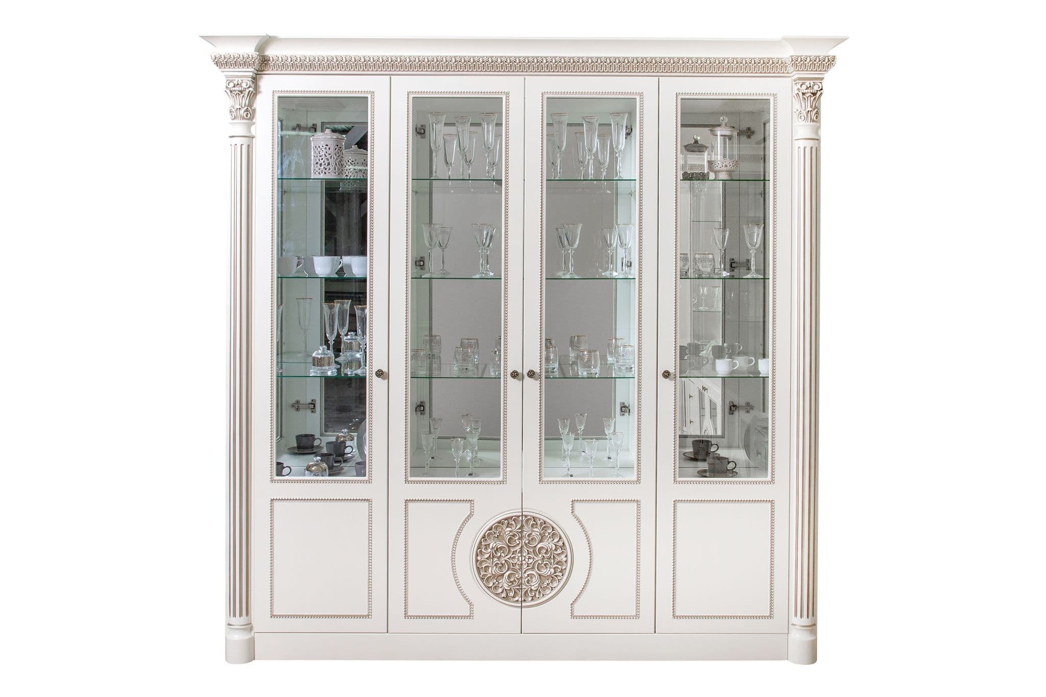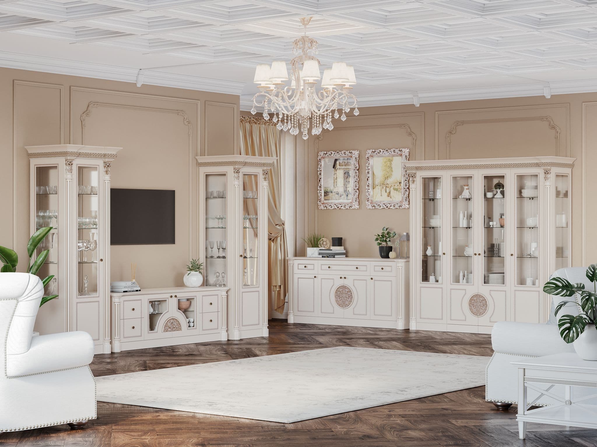 Элегантная гостиная в классическом стиле с изысканными витринами, резными фасадами и мягкой цветовой палитрой. Функциональные шкафы и тумбы обеспечивают удобство хранения, а натуральные материалы и гармоничные детали подчеркивают благородство интерьера. Декоративные элементы придают обстановке утонченность и уют.