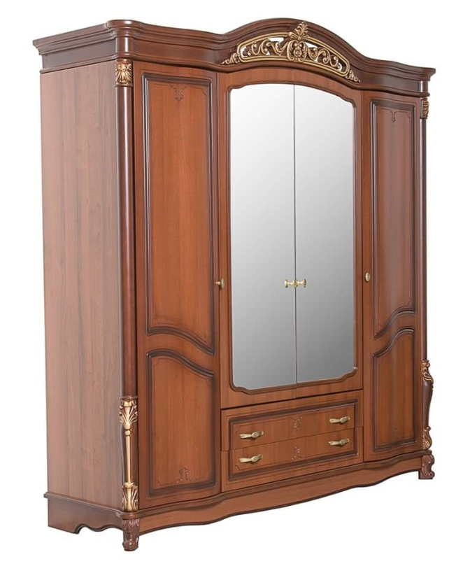 Шкаф четырехдверный "Касандра" – это воплощение роскоши и элегантности! Материал корпуса — высококачественный ламинированный ДСП от известных европейских производителей, фасад украшен изящной фрезеровкой и декоративными золотыми акцентами. Стильное сочетание цвета ореха с позолотой создает атмосферу благородства и комфорта. Внутреннее пространство шкафа продумано до мелочей, обеспечивая удобство хранения вещей. При заказе мебели "Касандра" вы выбираете безупречное качество и изысканный дизайн для своего дома. Единственное место в доме, которое должно полностью соответствовать всем внутренним пожеланиям, несомненно, является спальня. «Касандра» считается поистине королевской благодаря соединению пикантности и удобства. Плавные линии, темное дерево и позолоченные элементы декора придают образу необыкновенную утонченность.