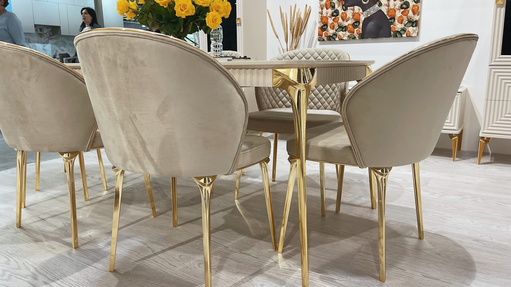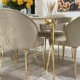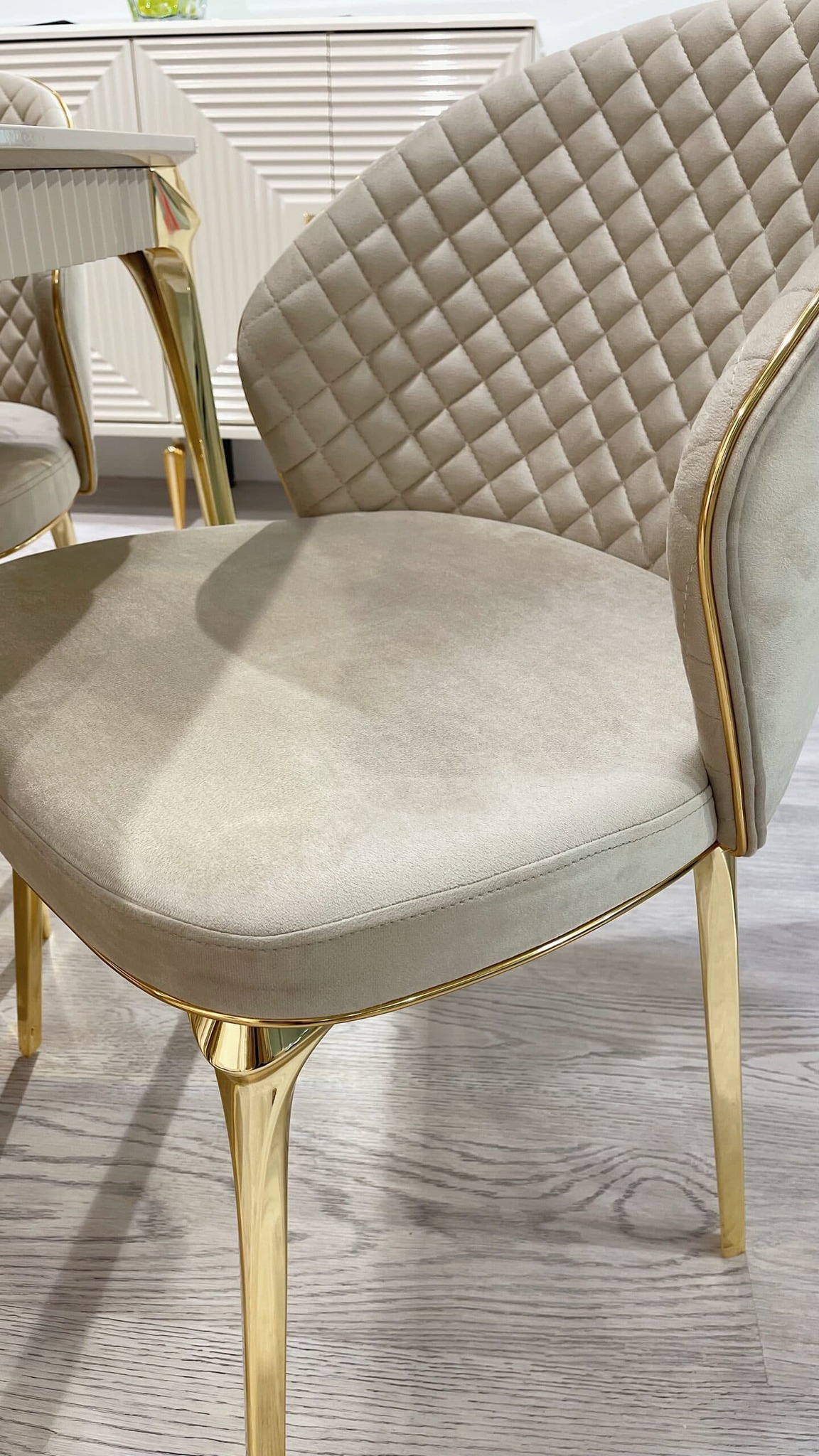 Размер стула – ш: 570 мм, г: 600 мм, в: 840мм Каркас – Фанера березовая, ЛМДФ Ножки – металл глянец золото Emaks (Турция) Ткань – Велюр цвета бежевый или атрацит (Китай)