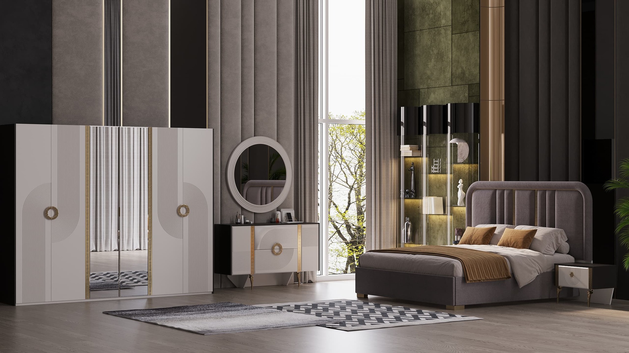 Шкаф 6-ти дверный ш: 2682 мм, г: 600мм, в: 2240 мм Кровать 1.8 ш: 2244 мм, г: 2050 мм, в: 1457 мм Тумба ш: 622 мм, г: 401 мм, в: 476 мм Комод ш: 1440мм, г: 440 мм, в: 877 мм Зеркало ш: 1060 мм, г: 34 мм, в: 1060 мм