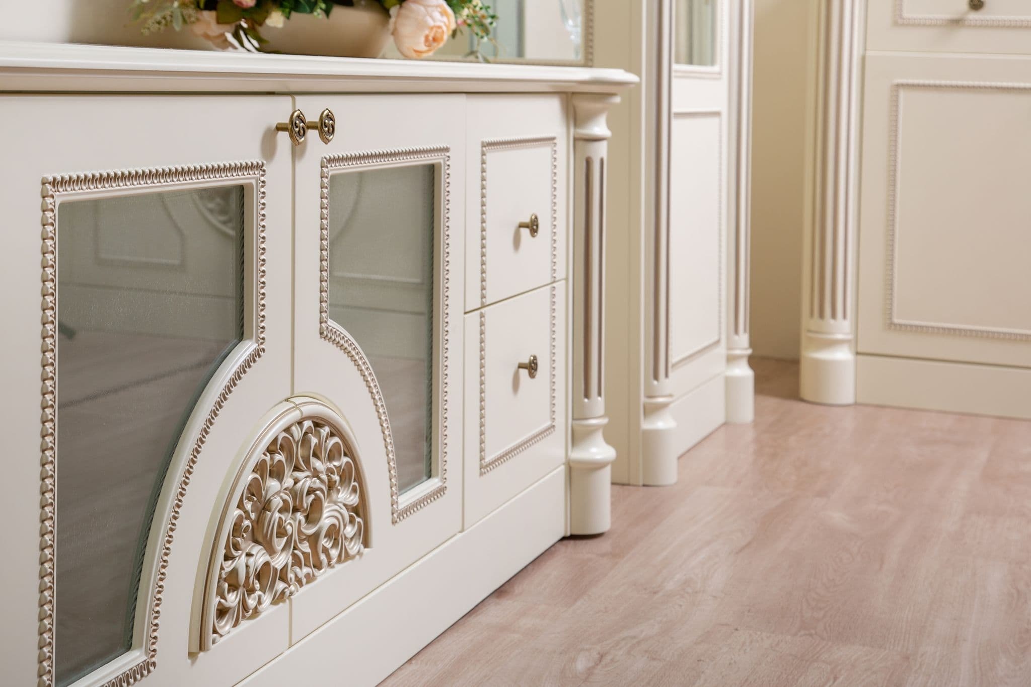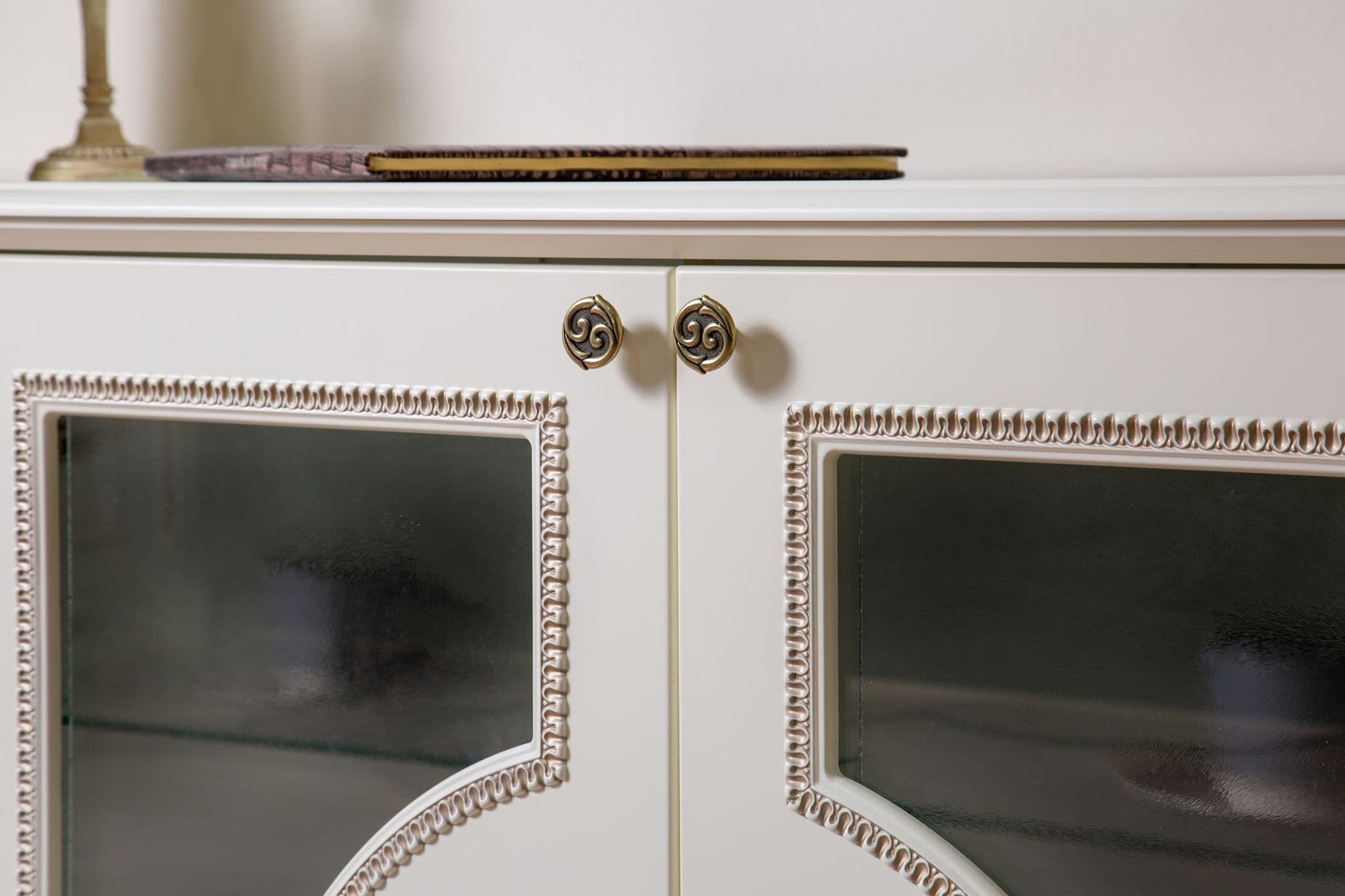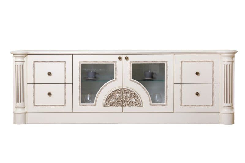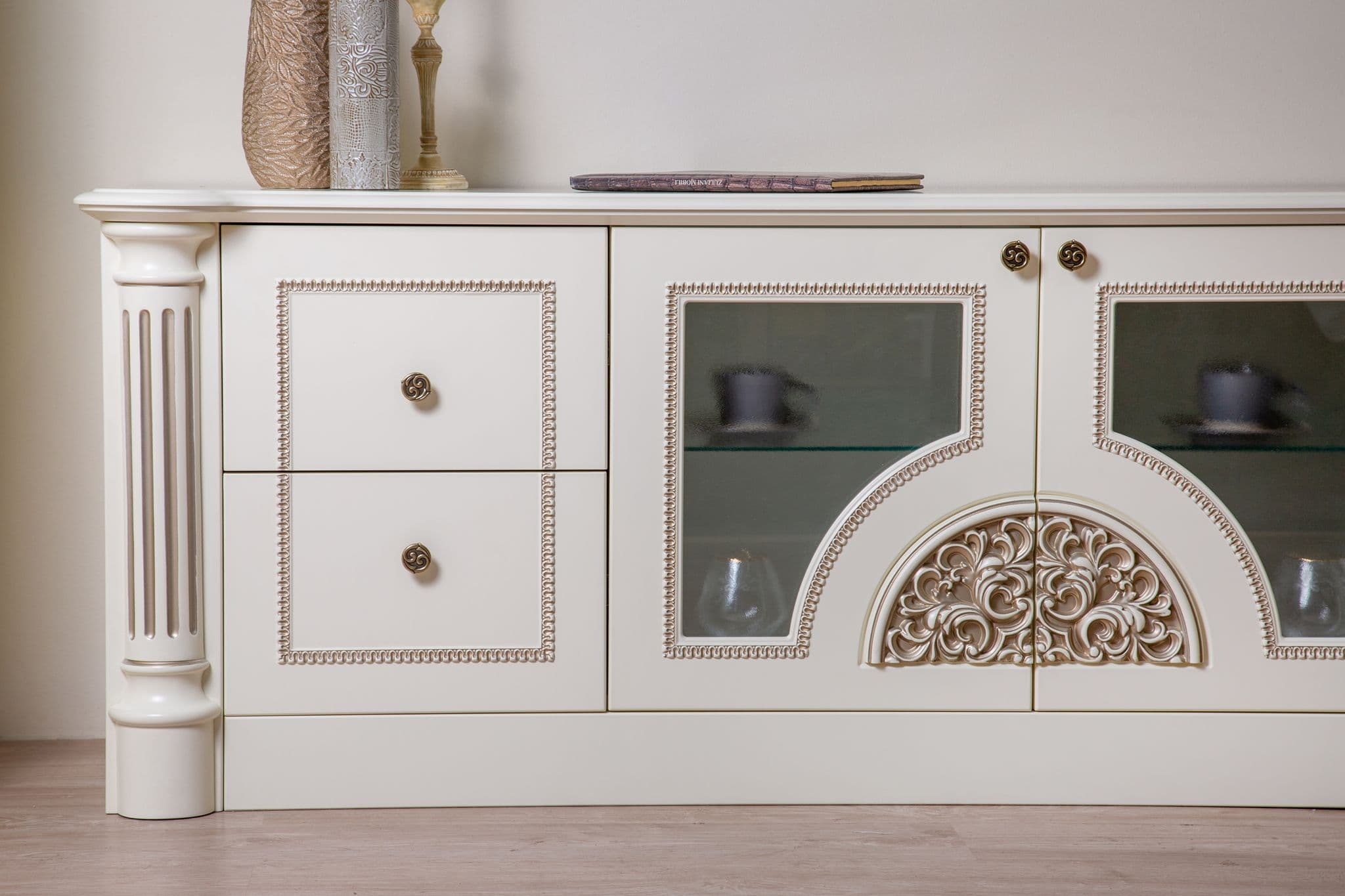 Элегантная гостиная в классическом стиле с изысканными витринами, резными фасадами и мягкой цветовой палитрой. Функциональные шкафы и тумбы обеспечивают удобство хранения, а натуральные материалы и гармоничные детали подчеркивают благородство интерьера. Декоративные элементы придают обстановке утонченность и уют.