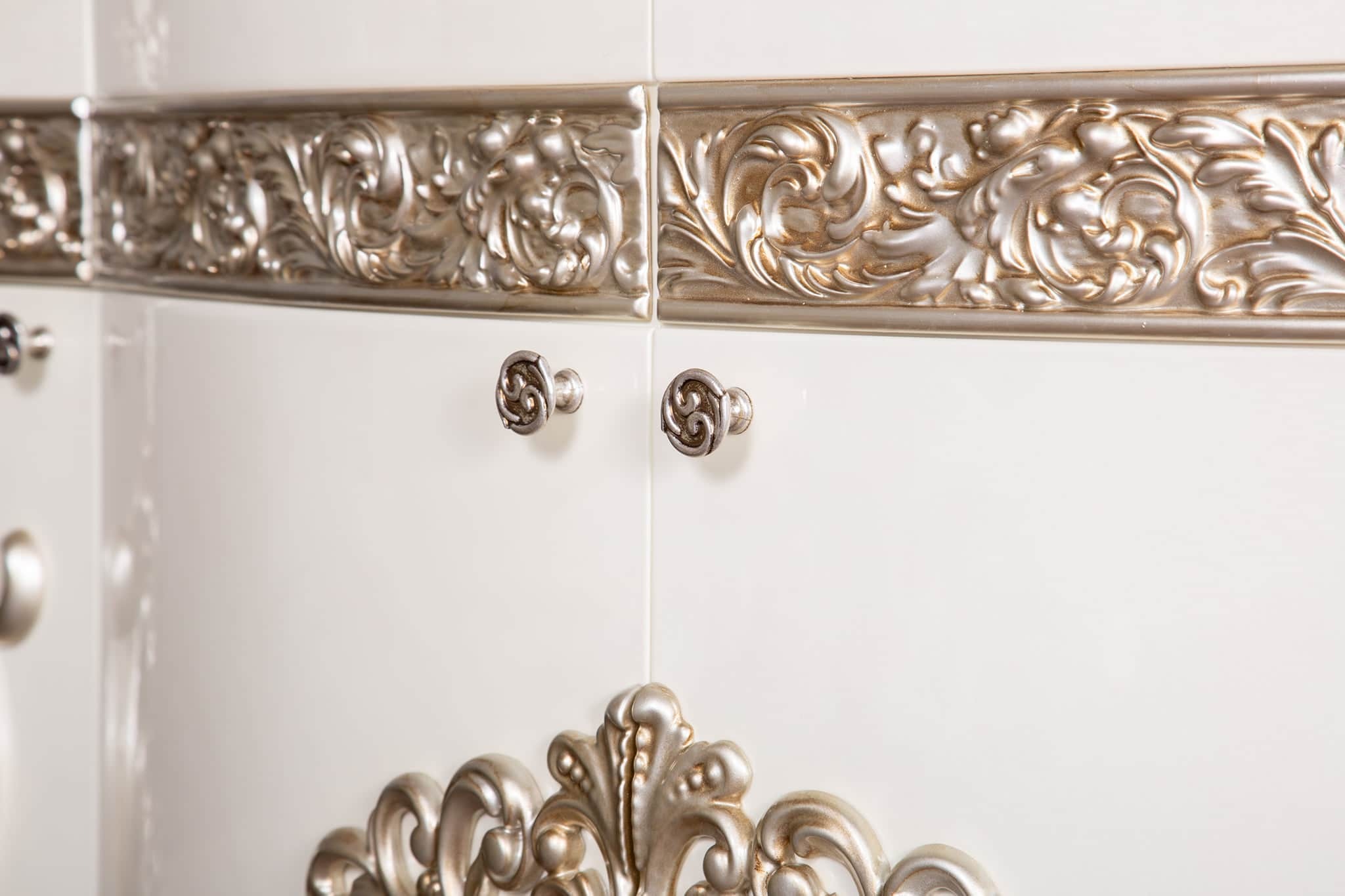 Фасад прямой и гнутый, крашеный ЛМДФ с фрезеровкой и элементами декора, лак глянцевый, карниз и стоевые из пенополиуретана